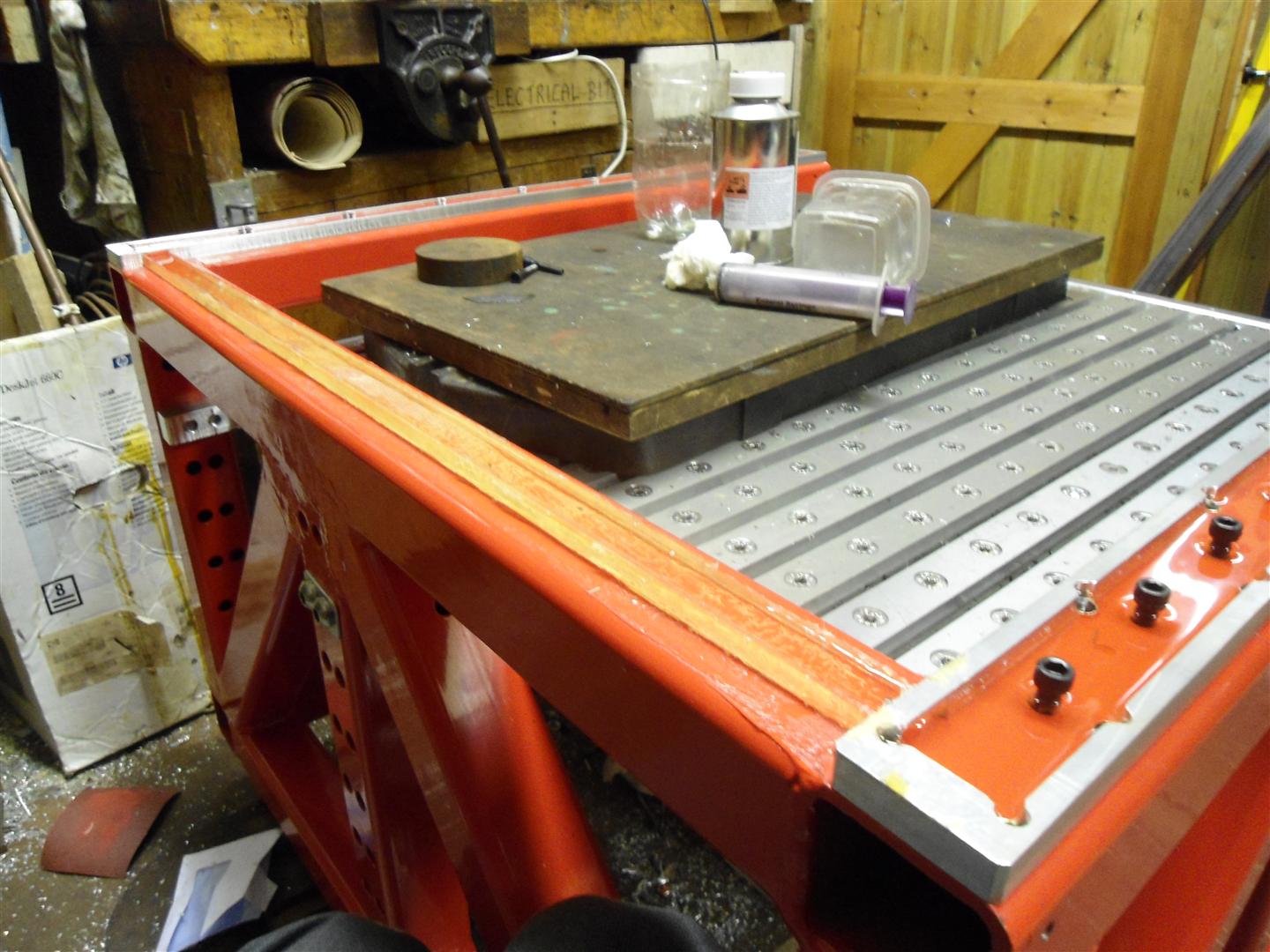 We did not want to sacrifice strength of the frame just to make it easier to mount the X-rails accurately, so we decided to fully weld the frame and compensate for any discrepancies in the rail mounting surfaces later on. M12 tapped holes have been added in various places so that the frame can be filled with sand or some other material to aid damping. This will be done some time in the future if deemed necessary - for now the frame is empty. The following images show the process: