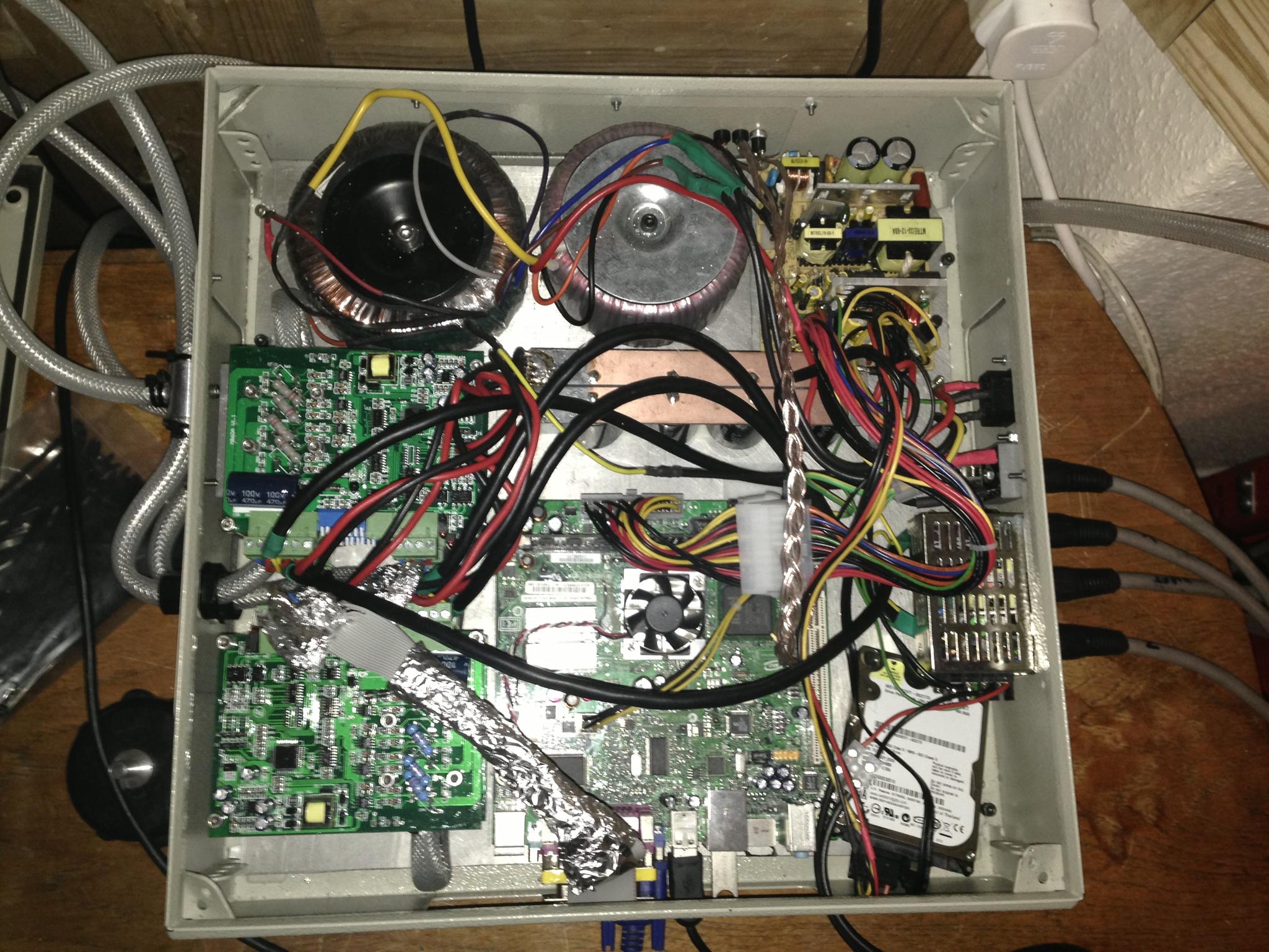 To increase reliability, eliminate moving parts and save space we decided to water cool everything in the control box. After the stepper drivers and VFD were dismantled, water blocks were attached to the motherboard, stepper drivers and VFD. These were then mounted alongside the power supply and breakout board inside the control box. Since the spindle already required water cooling, this was pretty straightforward.