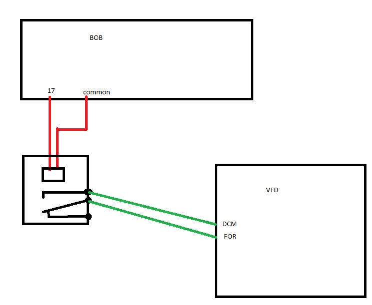 The relay isn't actually necessary - you could just connect the output from the breakout board to the relevant input on the VFD. Just remember to connect the common grounds. Let me know if that's not enough information...