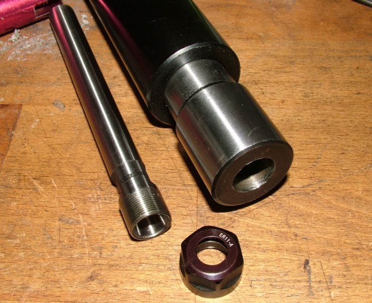 The plan is a false spindle set inside a 3MT soft end arbor and a lay shaft with two timing belts. That way the false spindle with it's ER11 collet can turn at 9 times the main spindle speed.