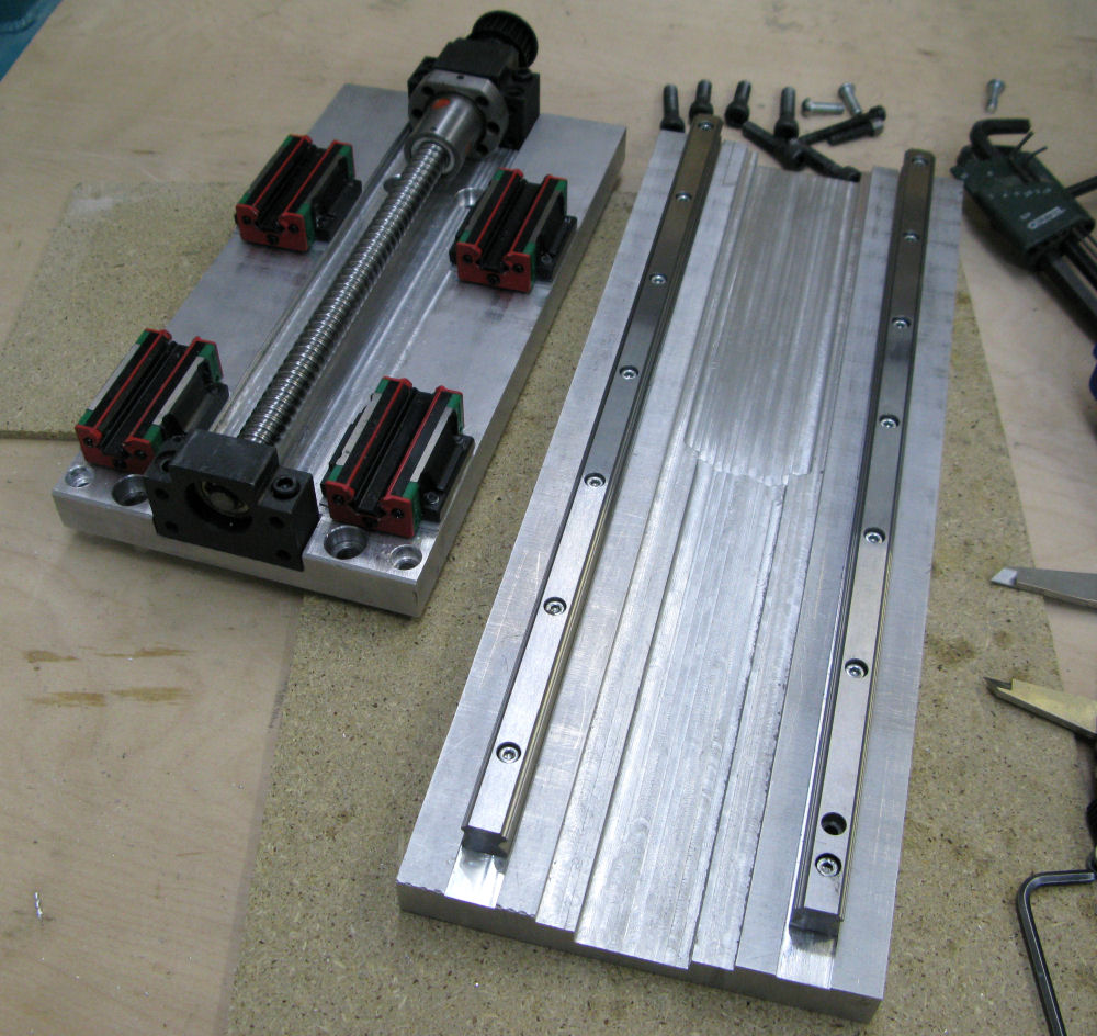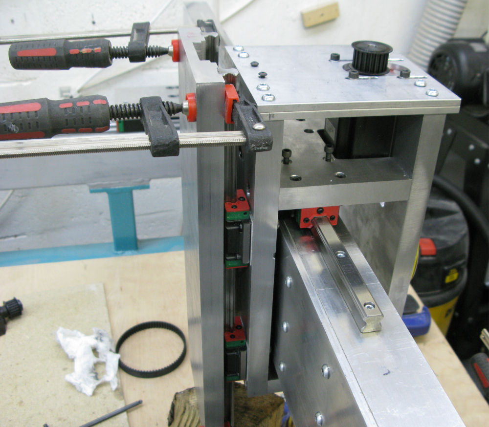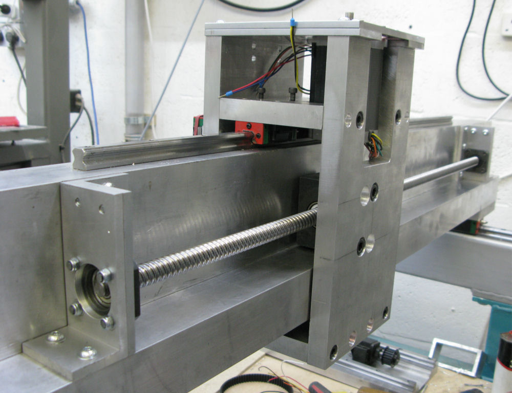 The backplate where the ball screw is attached was 'milled' using my overhead pneumatic pin router and hand guiding the aluminium plate against a straight edge that was gradually moved across half a cutter width at a time.