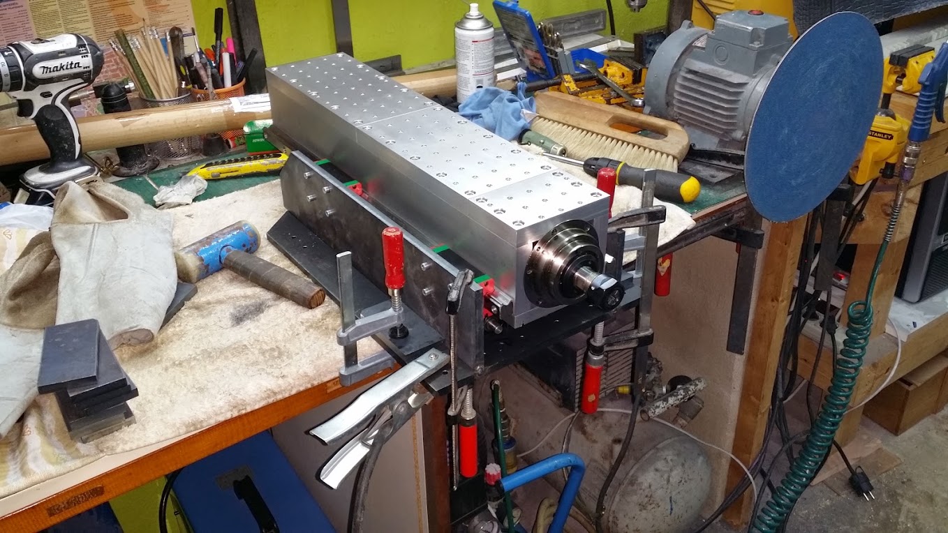 The key to my way of thinking, apart from no skipping, was hard stop mounting, means i don't measure anything/cause i don't have the means to, instead i rely on straight edge, square and touching without gap. On the first machine i have made i managed to achieve 0.01mm more or less in all directions. This one was quite bigger challenge.