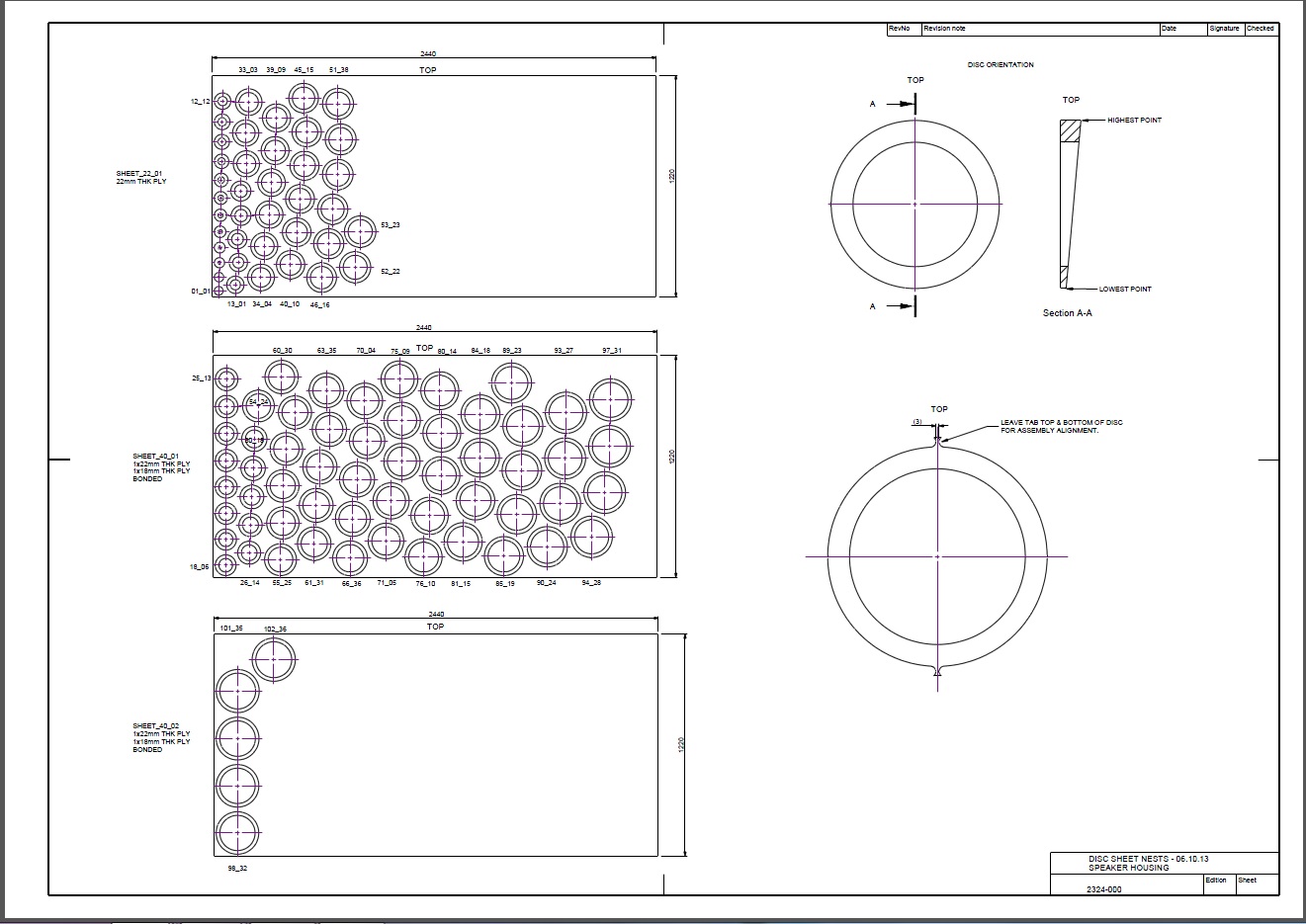 The design is completed, the disks have been nested for a ply sized 1200*2500. The file is an .STL ready for CNC routing.