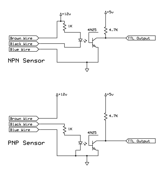 Diagram attached shows how to use both PNP and NPN open collector proximity sensors.