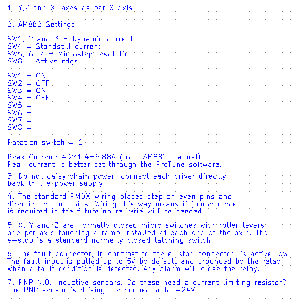 The PNP inductive home switches are wired as per the PMDX manual so I think they are correct but I don't understand what is stopping them dumping a ton of power into the PMDX when the sensor is triggered. Do I need a current limiting resistor in the circuit and if so what size? Actually the same question goes for the AM882 fault circuit.