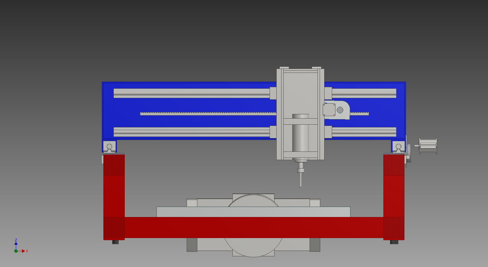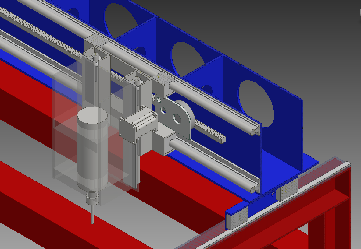 Using one stepper motor running two ballscrews is not practical as equivalent mass of whole system would be 255 kg to handle by only one stepper motor - acceleration would suffer greatly and the price would be quite high. So I decided on R&P due to the lenght, width of X axis, as well as cost od double ballscrews for X aixs.