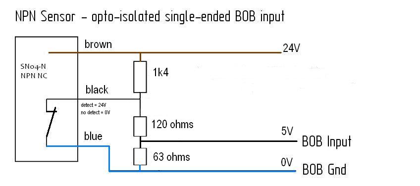 Depending on the inputs to your BOB you have two simple options. If the input is connected to an opto-coupler then connect the anode to the BOB supply voltage (5V) and connect you proximity switch output to the cathode (may need to add a series resistor if BOB does not have one). If the BOB has a logic type input then simple connect the proximity switch output to the input. You may need to add a resistor between input and BOB supply (5V) if one does not already exist on the BOB.