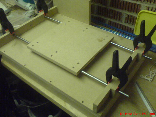 You can see in the picks that I’ve test fitted the bronze bearings and mounted the table onto the rails, I also started with the Bronze Bearing support plates that go underneath to secure them, again the plans call for 50mm x 50mm blocks but I’ve made mine 50mm x 330mm so they are one piece and very accurate. I’ve got one cut and routed and the other is done and just needs cutting from the sheet of MDF I’m working from, I will post about them tomorrow once they are ready to be used and fitted to the table.