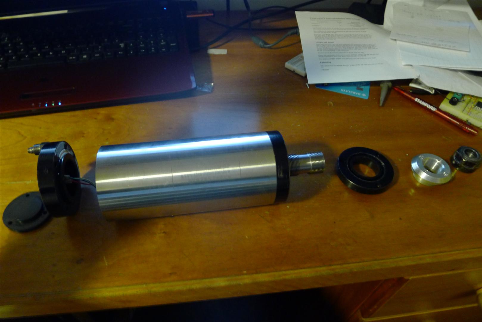 I tightened the grub screw on the z axis and tried to move the spindle up - this is where my new found respect for the power of the stepper motors coupled to ballscrews came from - The spindle was stuck fast. As I tried to raise the z the spindle stayed put and the whole machine flexed like a banana! Now I'm the first to admit that my machine is no heavy weight (x - 25mm unsupported | y - 20mm unsupported | z - 20mm unsupported) but I thought the steppers would have stalled before the frame tried to fold in half!