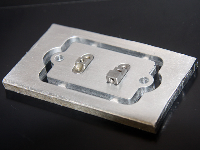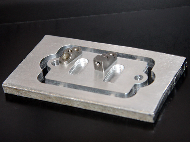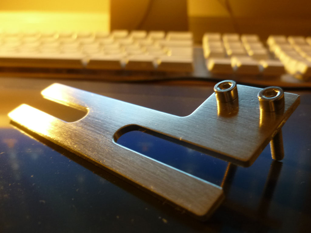 This is a part that my machine made for itself. It mounts to the plate edge and holds an inductive proximity switch. The idea is to be able to tweak the position of the limit/home switch. Machined in about 10 minutes.