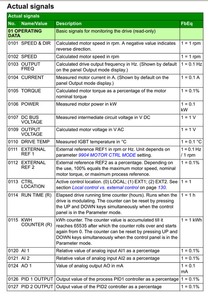 These are just some parameters available in the ABB ACS355 inverter for example, torque, current, speed are there, a Fieldbus interface could be used to read these.