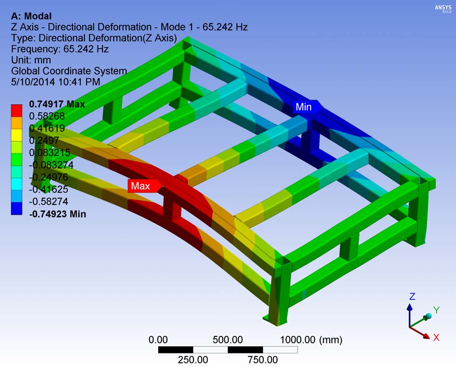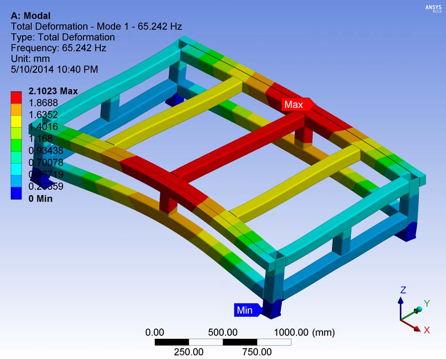 - 1st Mode: modal frequency: 60.69 Hz - maximum displacement: 151.2 mm (too high! I think if I use ANSYS more precise results could be found)