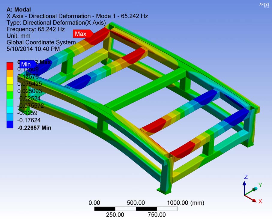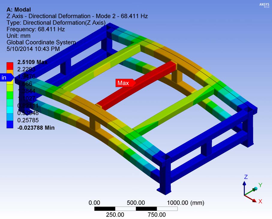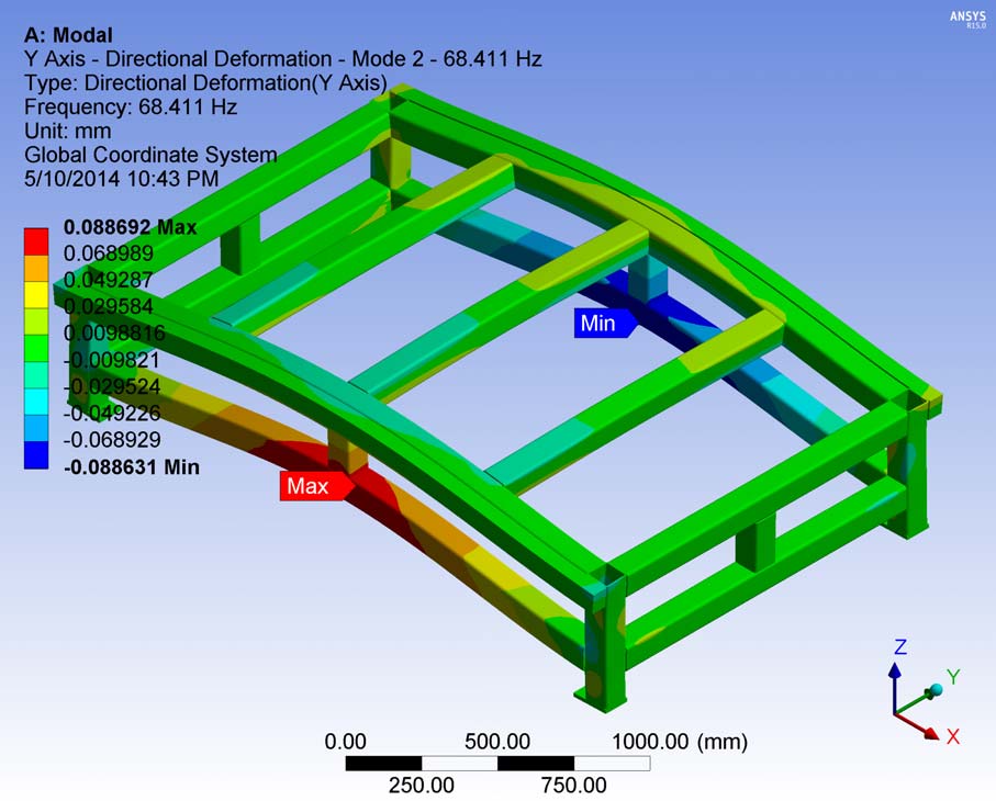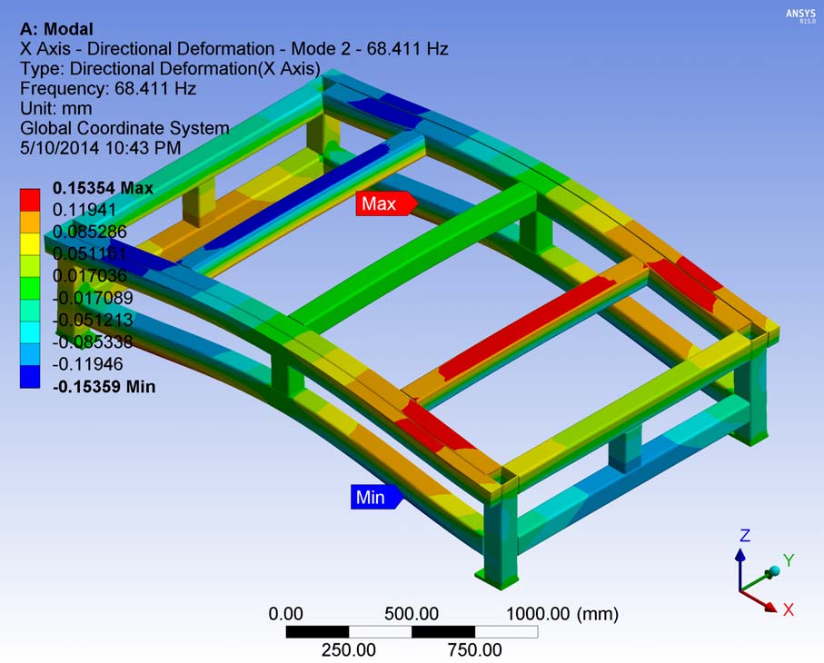 - 2nd Mode: modal frequency: 66.76 - maximum displacement: 151.2 mm.