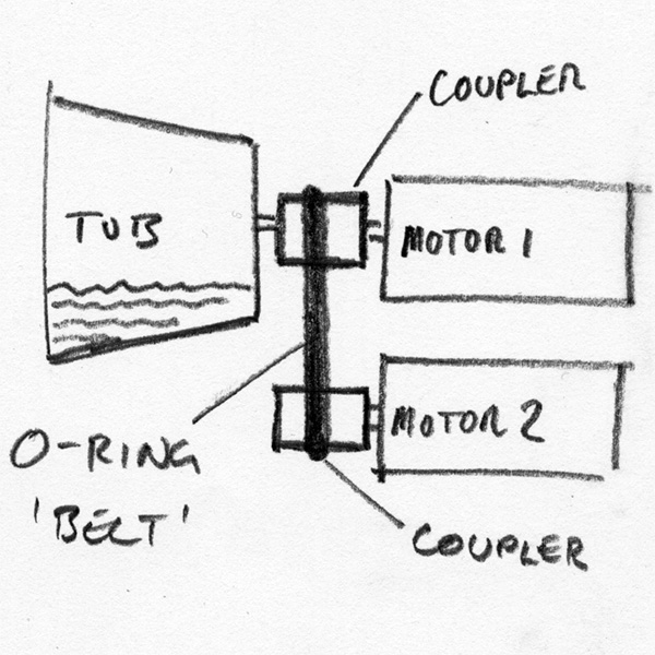 Although the 12v 350mA 20RPM motor spins the tub reasonably well (provided that the static friction remains low) I'm thinking of adding an identical motor below it and connecting it via a nitrile o-ring belt so that it's 'helping out' the motor that's directly driving the tub, like so: