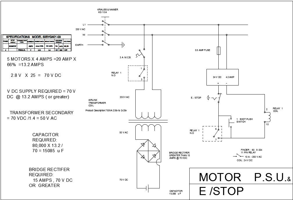 well here is the PSU and e stop circuit . i'm not sure if my calcs. are correct so i could do with a second opinion. i have calculated for 5 motors but i'm only using 4 to get the me up and playing . the 5 motor will be for the A axis further on up the road ( https://www.youtube.com/watch?v=EIwEh6ZmFFs) i have calculated for the lowest cap. and rectifer but will go with something with more head room. any way , feed back would be great , cheers in advance