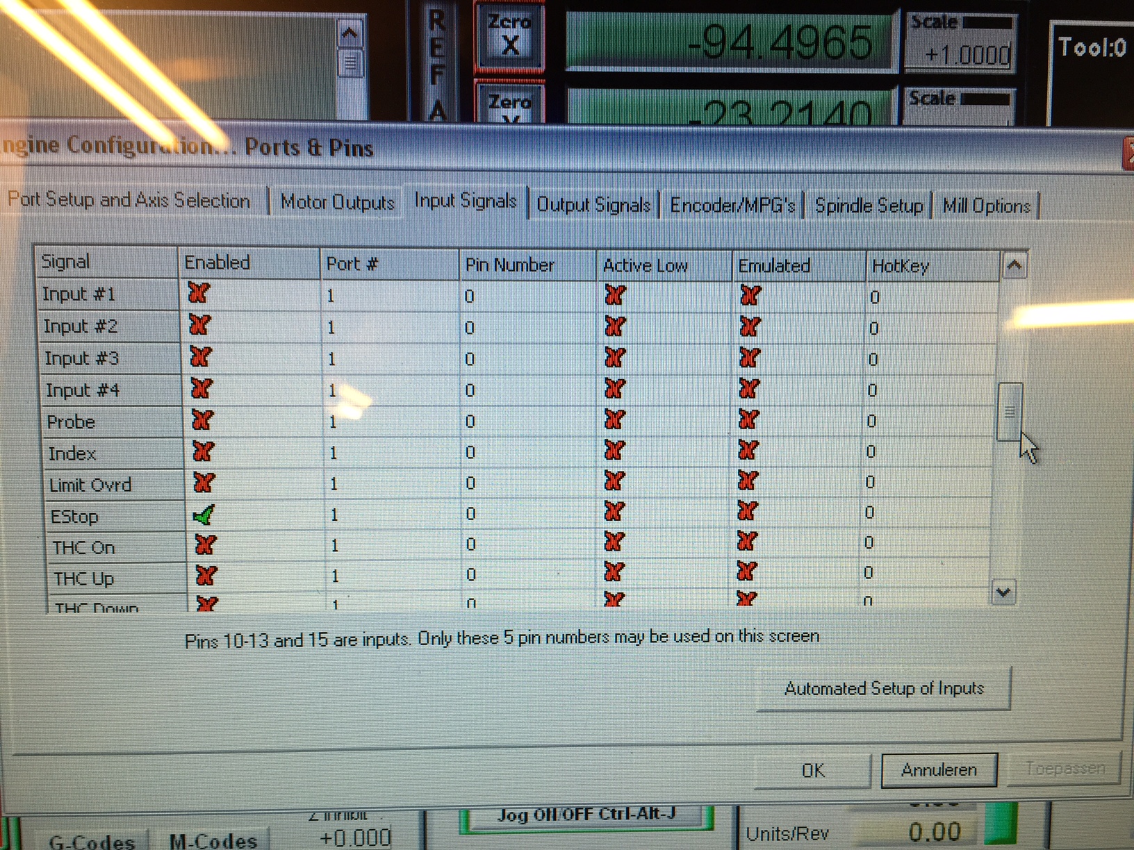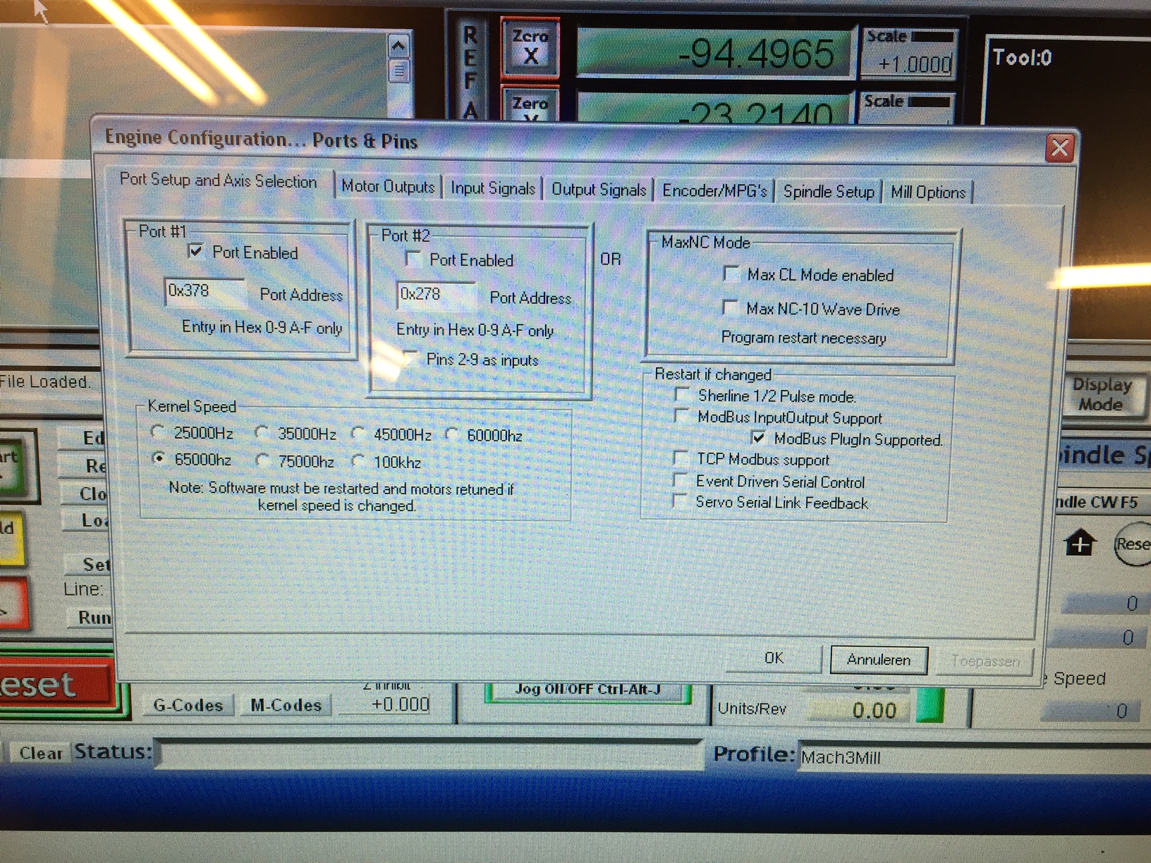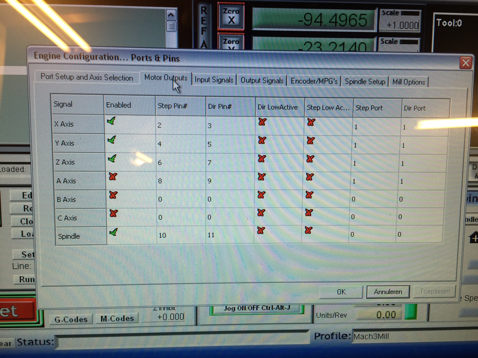 the settings in the photos are of the one from whom I bought the machine. I myself had already both "Step Port" and "Dir Port 'changed from 0 to 1. So" step Port "is one and" Dir Port "is 1 but the result remained the same, no rotating spindle motor . I also have afther the change this, Mach3 restarts.