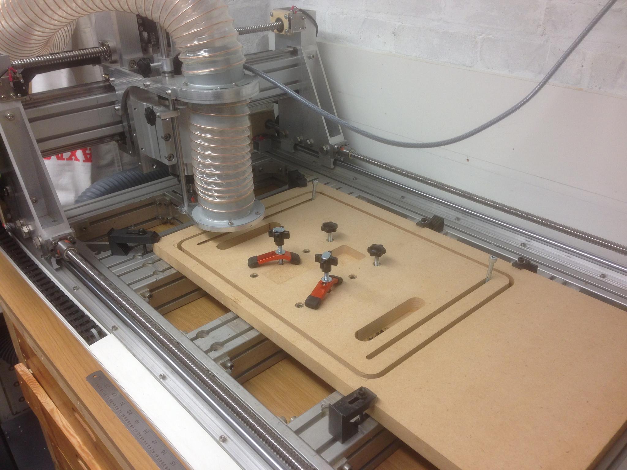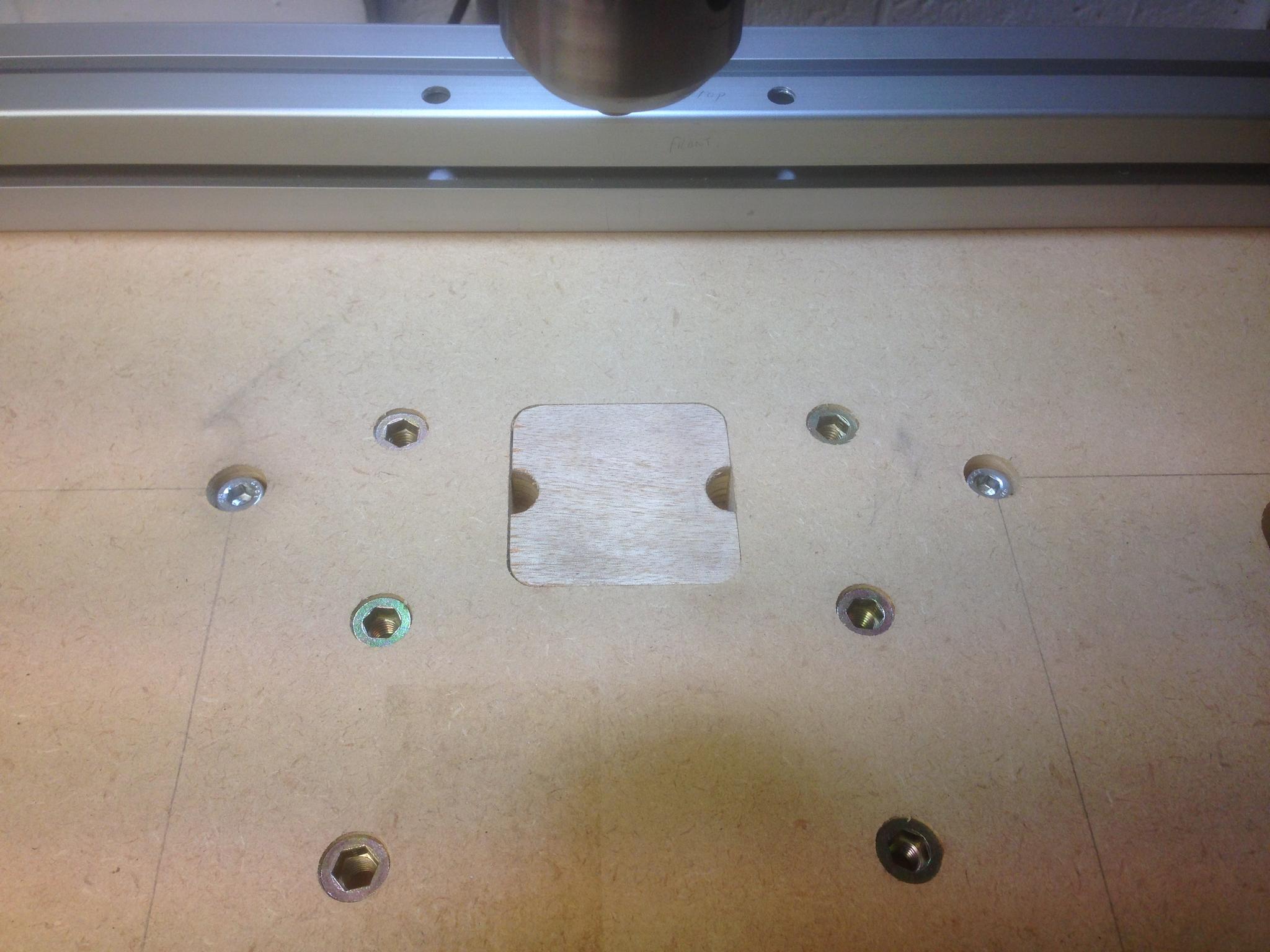 CNC machined 3off mini spoil board to go in the pocket in the middle of the table. Missed a trick here and should have offset the pocket to one side or fore/aft of the drilling point. Then you can rotate the mini spoil board around 90 degrees and get a fresh surface. Oh well.
