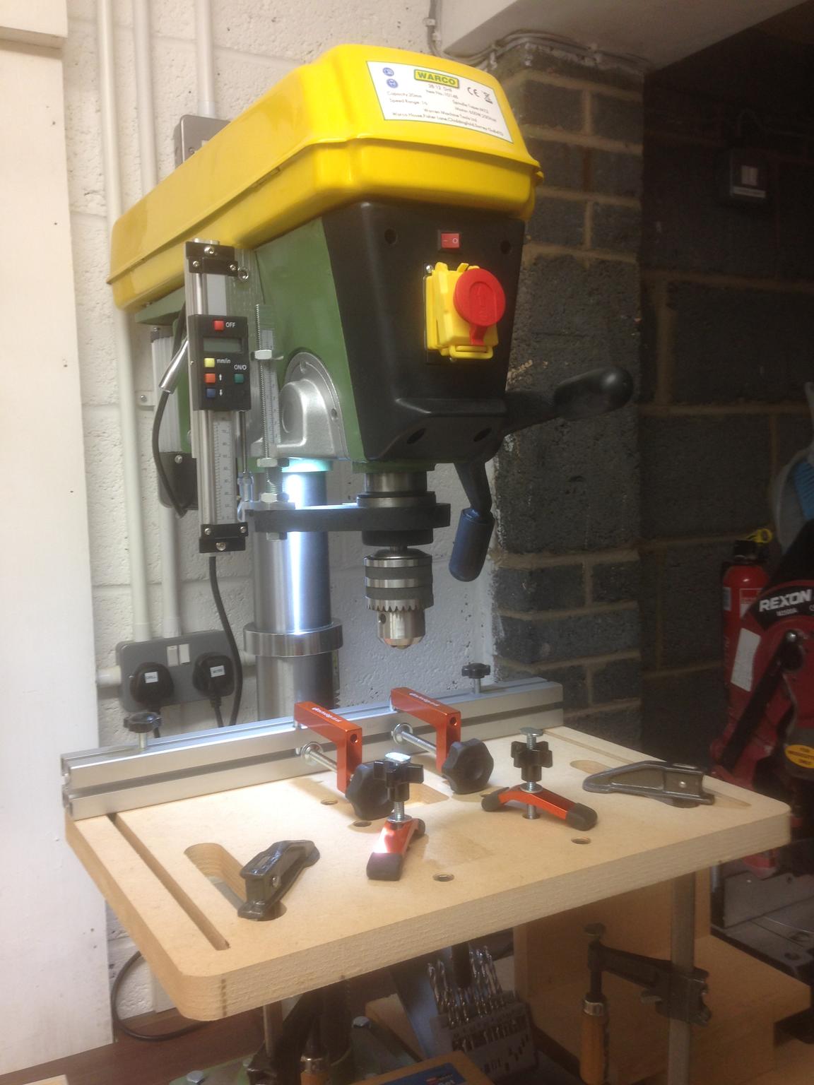 Plus thinking about adding a pair of drill press vices which sit either side of the chuck centre - makes it easy to drill angle plate, or hold long thin parts on edge. Again the pair of vices would be mounted on a wooden batton which can then adjust fore/aft.
