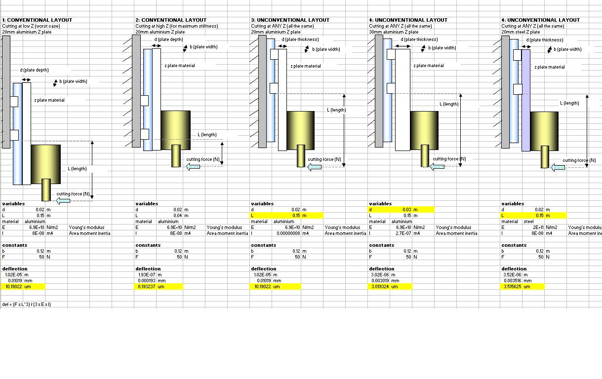 Anyway, the figures from that spreadsheet give me roughly .65 micron deflection, the conventional is slightly better at .19 microns but a lot worse at full extent with 10 microns but if I reduce my cutting depth to just 100mm by raising the bed and spindle by 50mm then I get .19 microns across the full cutting height!