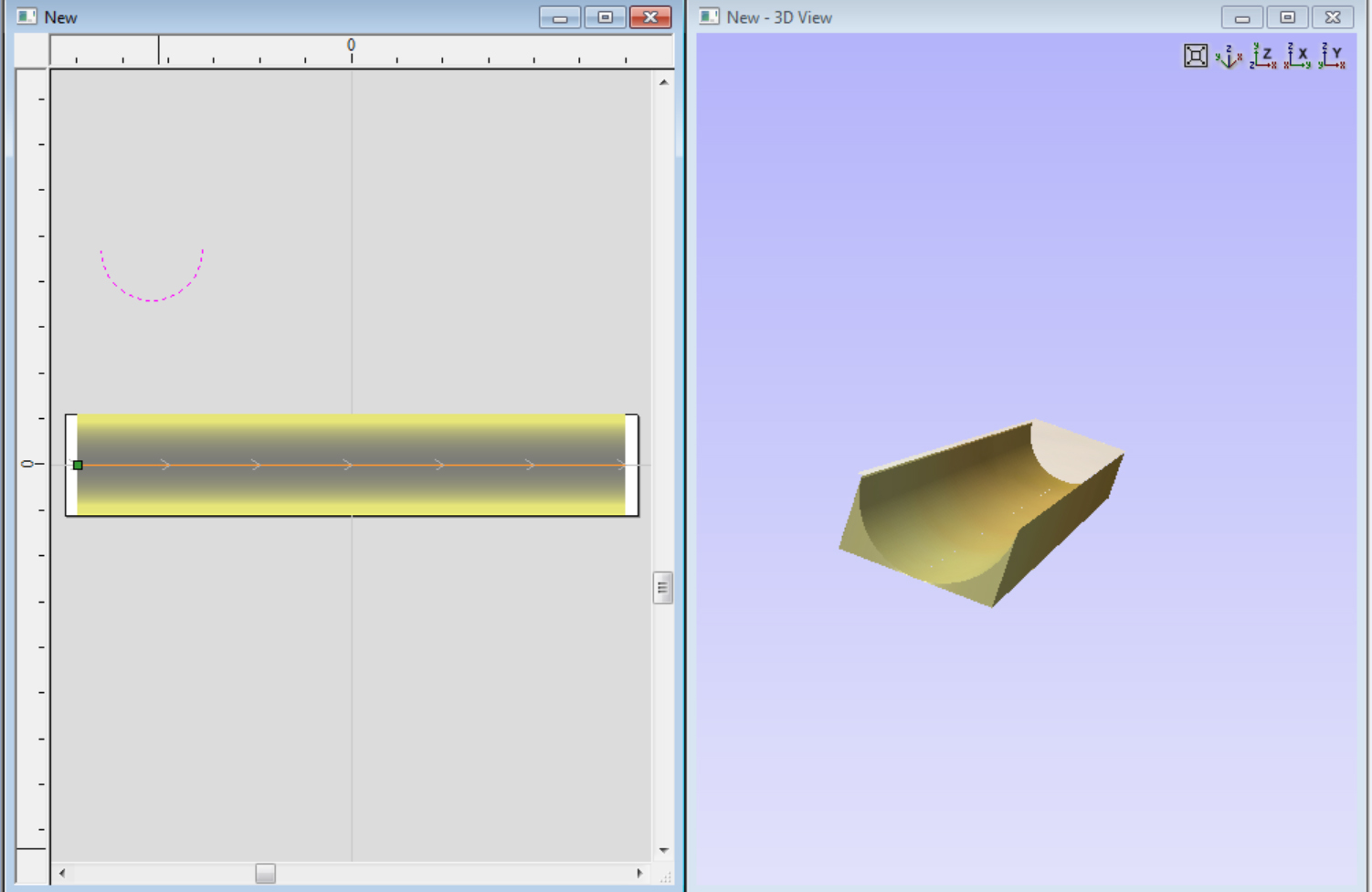 first draw a line longer than you need so you have overcut of the part, then draw a semi circle like the one in red in your software look for extrude, pick the line as your length of cut, then pick the semi C as your profile and merge them together, you need to orientate your part or the drawing to cross your part using the top face of the part as the XYZ =0 you end up with a semi circle cut into the part as shown.