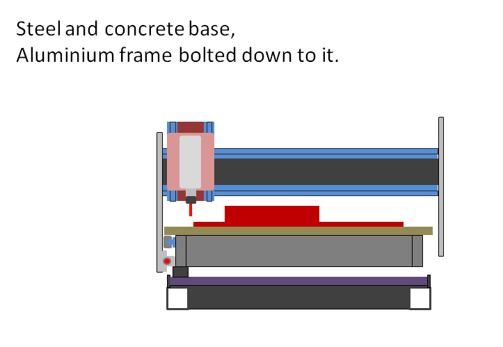 IMO the best thing to build a frame out of would be Sq section steel. There's no advantage to making a steel and concrete base, or steel and acetal frame so they're accurate and then bolting an aluminium frame to it that's probably not as accurate. Make the whole frame from steel, build in lots of adjustability and shim/file/fill the top rail (or go the self leveling epoxy route) so it's flat and fit the rails (which if supported round will not be level/flat) to that? Round rails are best mounted upright as the bearings aren't as strong on their side. At 1800 or 2000mm long you're into 20 to 25mm ballscrews to stop whipping at high rpm and Nema 34 motors...or rotating ballnut on 16mm ballscrews. Have a look at Kingcreaky's builds for inspiration (I'm sure there are others like Jonathan's first build to look at too but his spring to mind first as large wood routers, especially the last one!!)