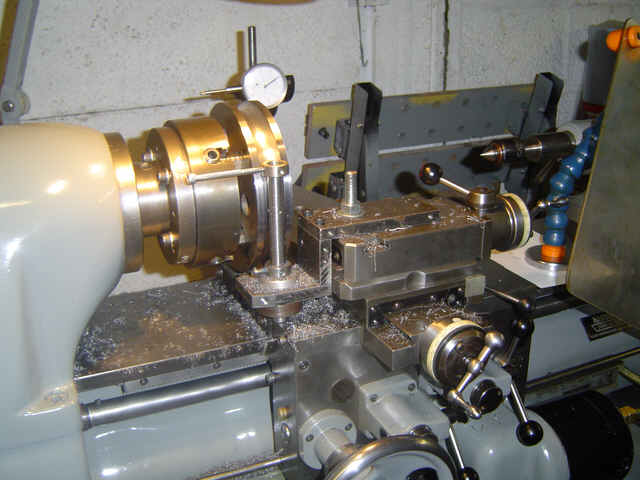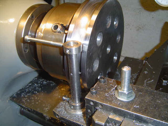 Well, the bearing block is (I think) part of a motorcycle hub; I fitted a couple of 5/8" centred ball races and turned it down to fit the clamp (the right-angled bit) from my home-brew T&C grinder. The clamp is bolted to another steel plate drilled to fit the tool-post bolt.