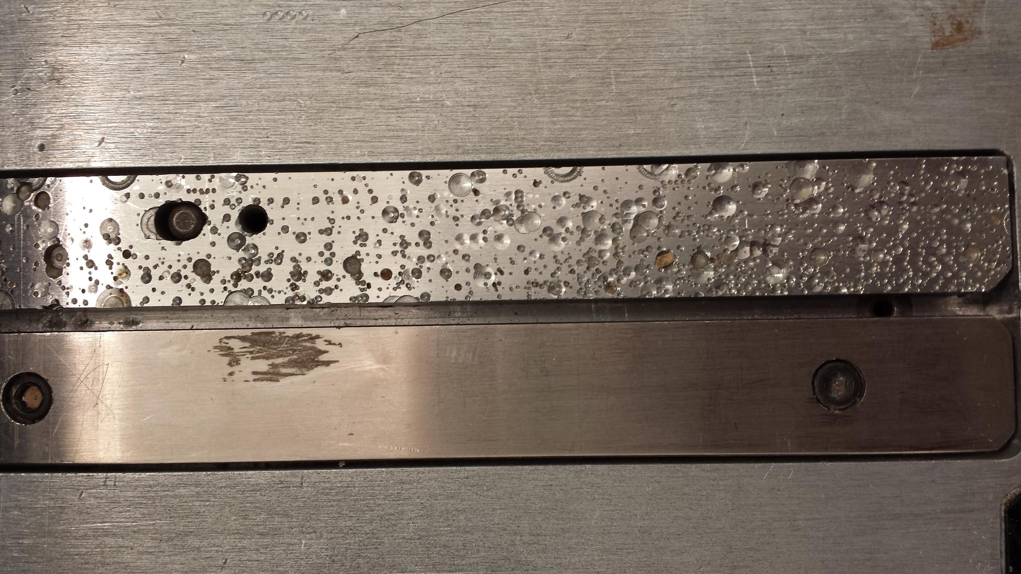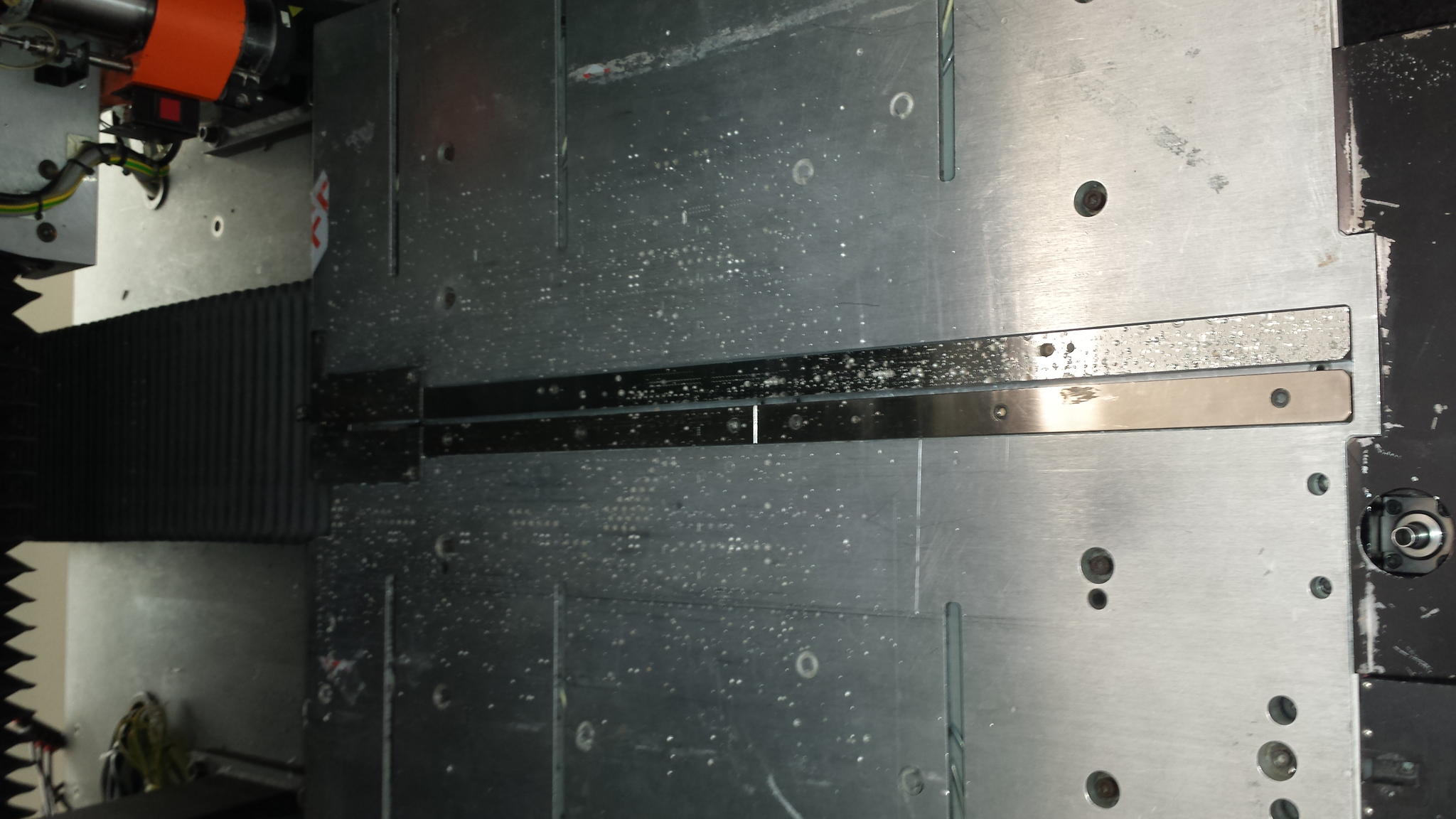 I have included pictures of the machine i`m working with, the bed of the machine which quite clearly has seen some wear and tear, the tooling strips which have also seen better days and one of the holes i have drilled with a very obvious step in the middle. the pictured hole is not a small diameter but is a 19mm hole which is drilled on the machine out of hundreds of 4.35mm holes.