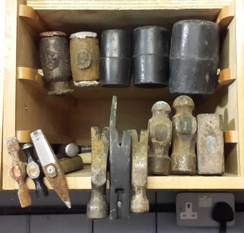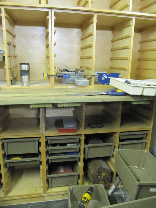 I've ended up with the back wall of the shop, floor to ceiling with these bins and a bench cantilevered out between them at a suitable height for standing at the bench. I had enough left to put them on one wall from head high to the ceiling giving a total of about 200 bays, 17inches deep, with either 3 inch or 6 inch high trays. Some I put shelves in as seen in the Hammer store below.