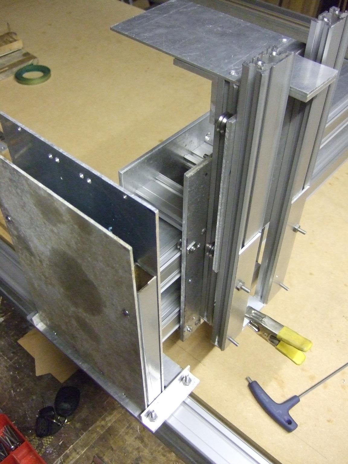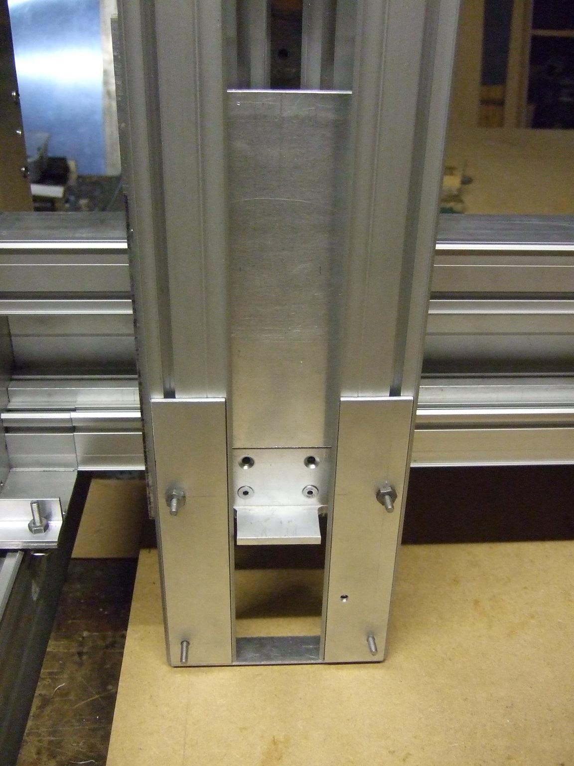 The ends of the gantry are connected to aluminium plate, which make up one face of a torsion box that connects to the carriage running on the X-axis.