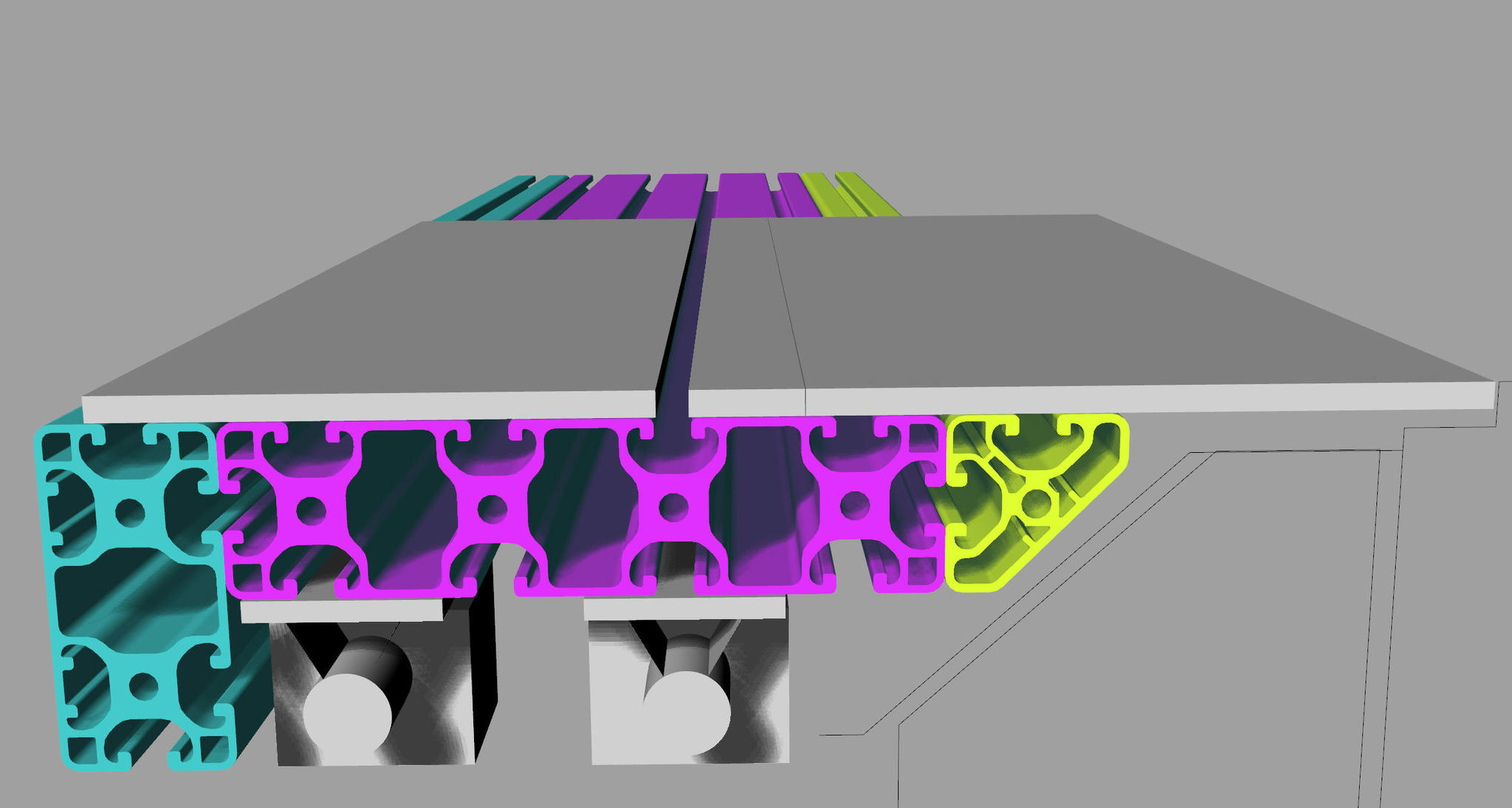 The picture shows a proposed sliding table for a saw bench. Three aluminium profiles 40x80, 40x160, 45deg. side by side with 6mm aluminium top pieces. The width across the top surface is just over 300 mm, total length of the assembly will be 1250mm. As you can see it's fastened to two SBR rails with four bearings fastened to the machine.