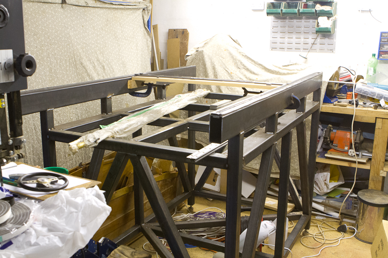 Top rails are about 1800mm, spaced at about 1000mm. Construction is all-welded, a mix of 50x50x3 and 100x50x3. As far as I can judge, the X rails dip in the middle by about 1.3mm. I don't know if this is welding distortion, or if the original box section was slightly bent.