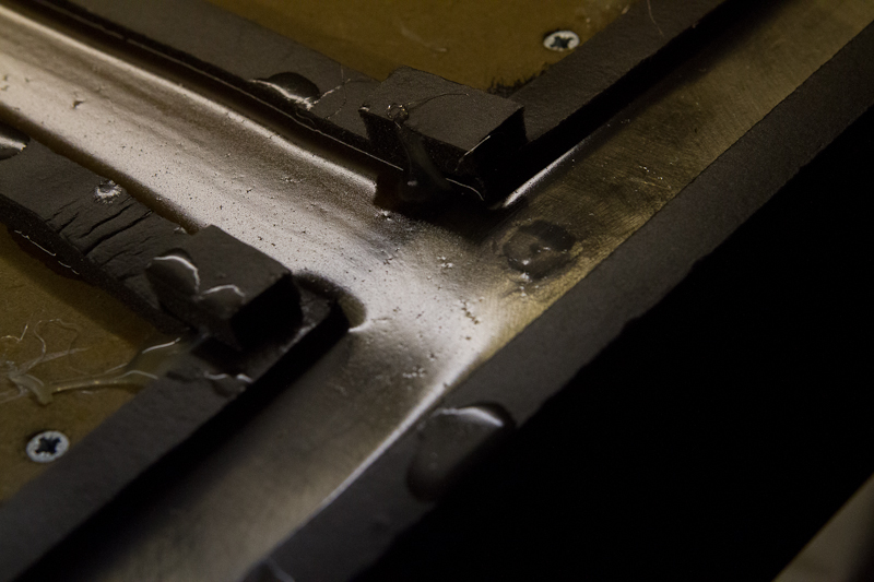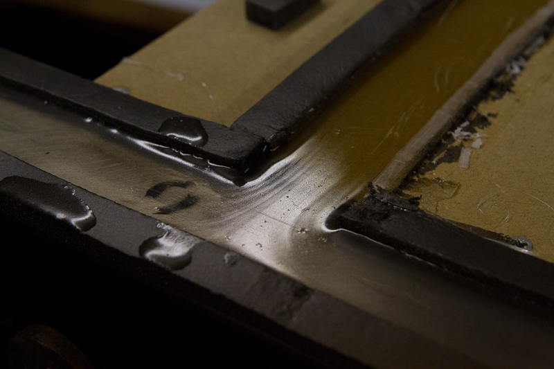 The dam uses Screwfix thick draught excluder, which stuck well. To avoid leaks in the corners, I used small dabs of hot-melt glue. I tested this first, in case it melted the draught excluder, but it seemed OK and worked well. The only leak, in fact, was over a couple of the plug welds that hold a 25x5 strip in the top of the rails (to take the tapped holes later). There was clearly a very slight weep through these. This shows the hot-melt glue, and the sink hole close to one end over a plug weld.