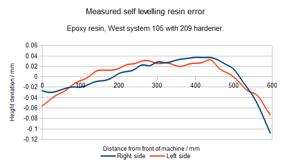 I had no idea just how level epoxy levelling left the surface so I checked one of my rails this evening. About 1750mm long, joined to the opposite rail about 1000mm away via a single central bridge. Epoxy around 4-5mm deep (there was a dip in the middle of the 100x50 box section rail support of about 1.5mm). Once set, I removed the meniscus from the epoxy with a coarse file and also ran the file over the top of a few bubbles that had formed.