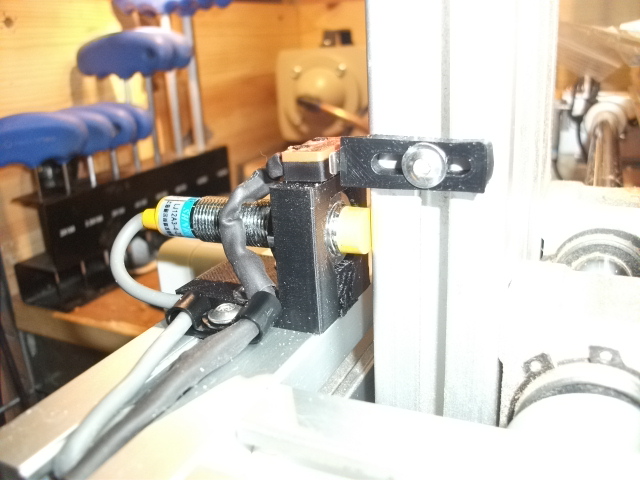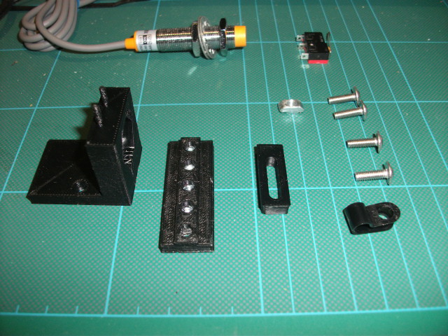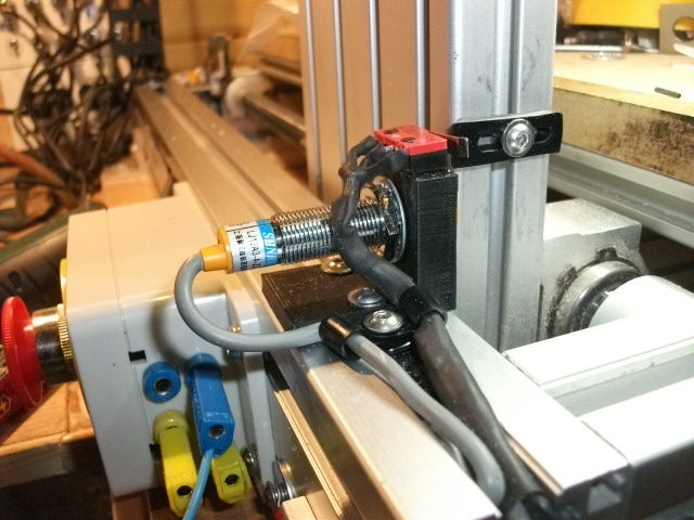 Pics 5 and 6 show one I made earlier mounted and working. The inductive sensor works fine against the aluminium of the profile and the limits microswitch is put on the plastic columns and then they are melted down onto the switch with the side of a soldering iron. The trigger on the side of the profile actuates the limits switch about 6mm after the Home position.
