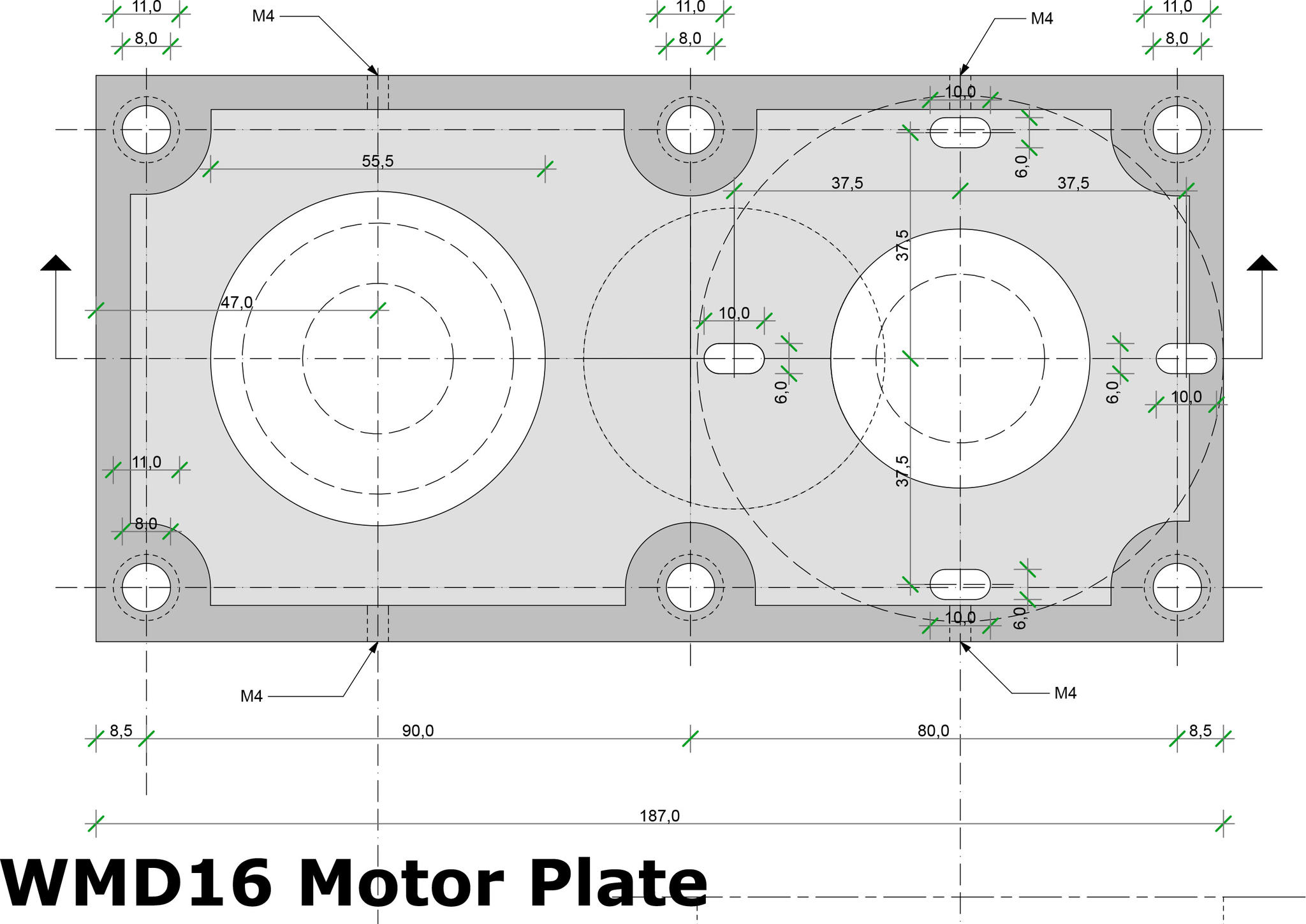 The pulleys are sized to give a 0.7 reduction on the standard motor - giving increased torque and limiting the max speed to about 4000rpm (based on 5600rpm stock motor speed).