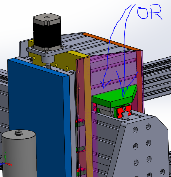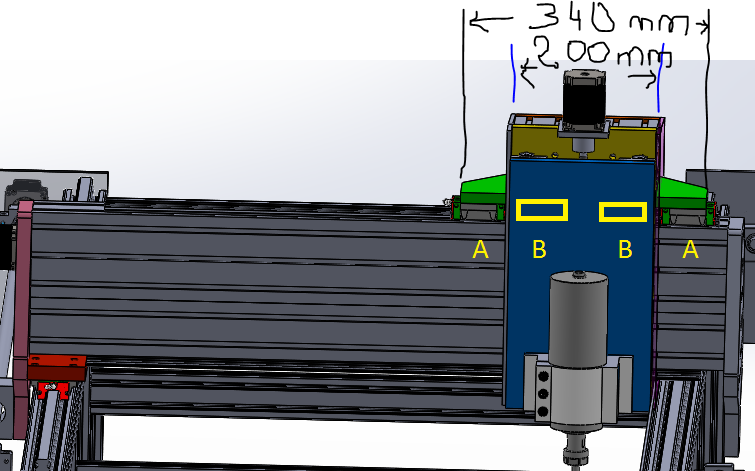 Do you think there is an improvement in mounting carriages on the side (position A : on the green plate on the pic) or behind the yellow plate (position B), I would say the position A is better as it is wider it doesn't reduce the working area and the external distance is 340mm instead of 200mm .but i can be wrong...