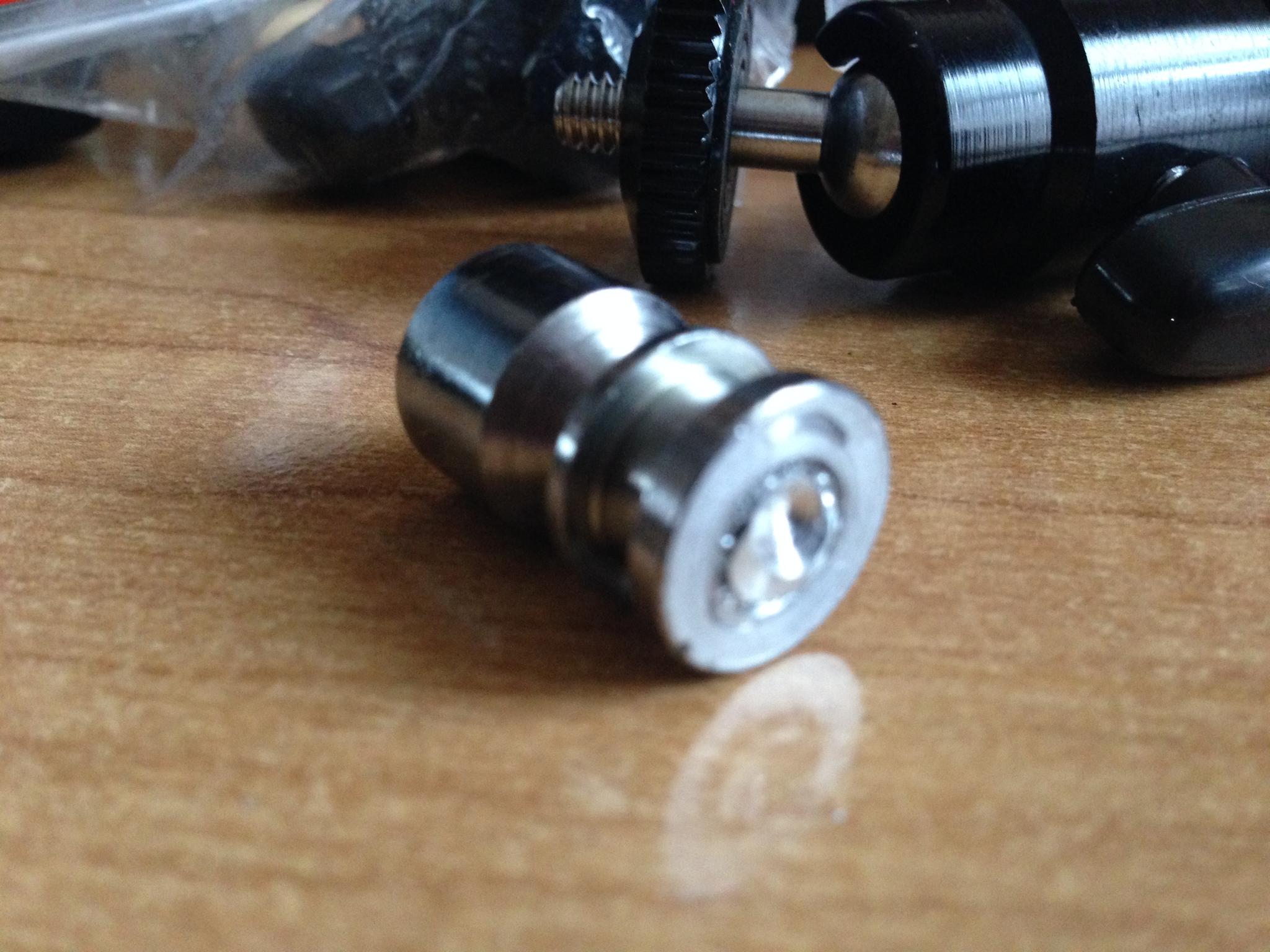 I've got three bits that I need to make compatible with a screw mounting. My original plan was to drill and tap, but the little buggers are perfectly round and defeating my ability to hold them straight. Plus I think I've just killed the plastic gears in the mill.