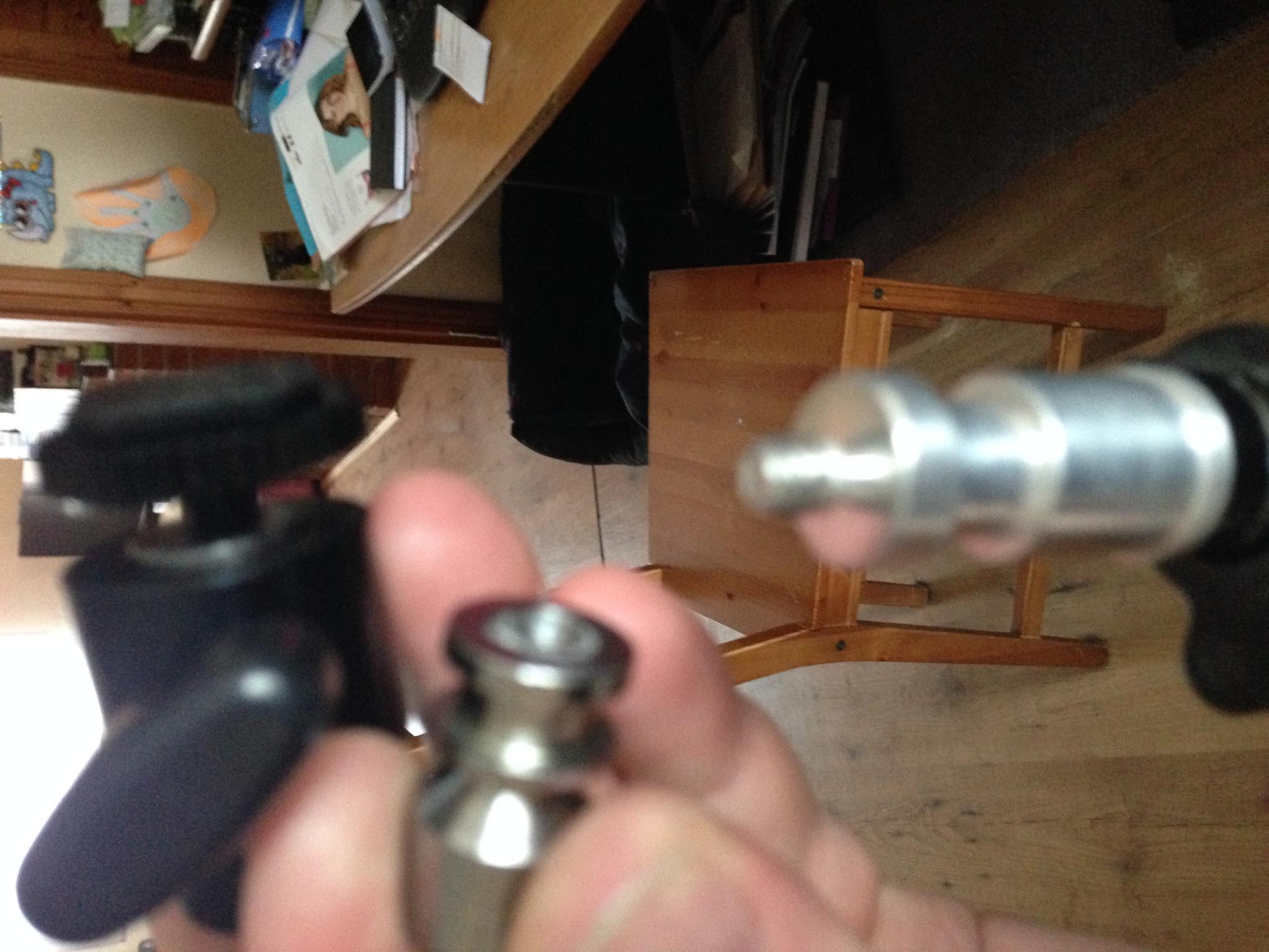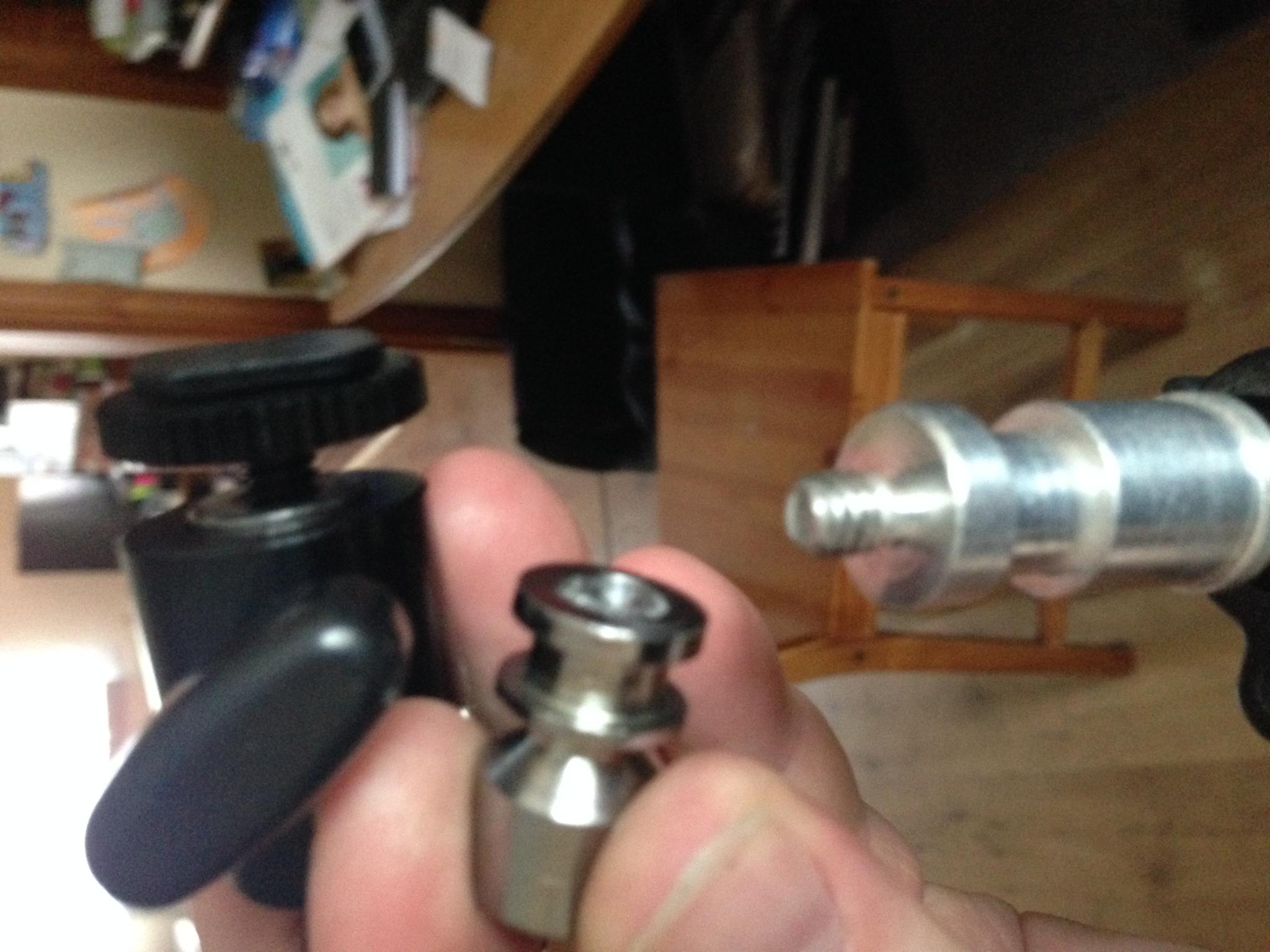The bit comes from a flexible ball-joint for a lighting stand (the black thing on the left in the second photo). Inside is a the round bit that I need to drill & tap (the first photo, also in the middle of the second photo). It needs to fit the thread on the stand (the light silver bit on the right of the second photo).
