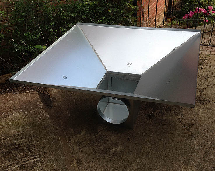 so conical collecting pan below table, short duct to fan, short duct to outside, smooth ducting all round.