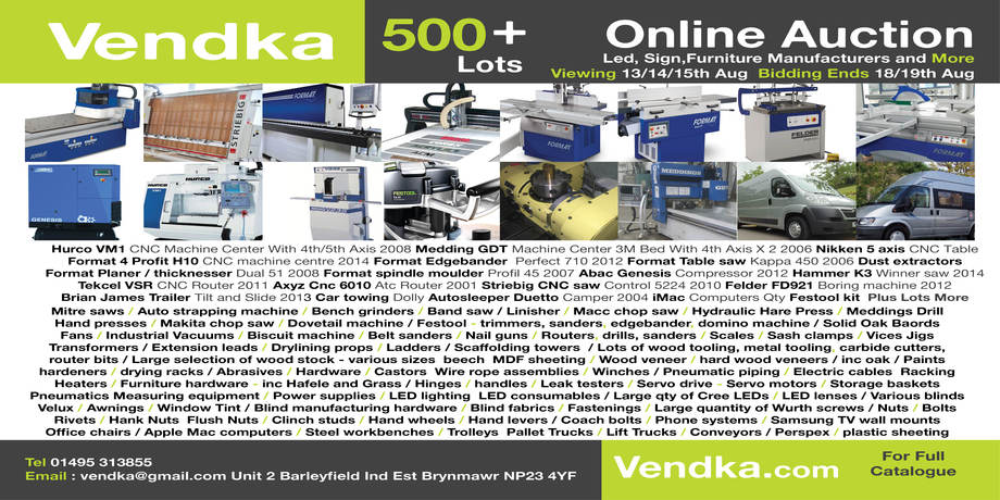 Vendka Ltd are currently holding a major online auction of Led, Sign, Furniture manufacturers and more.
