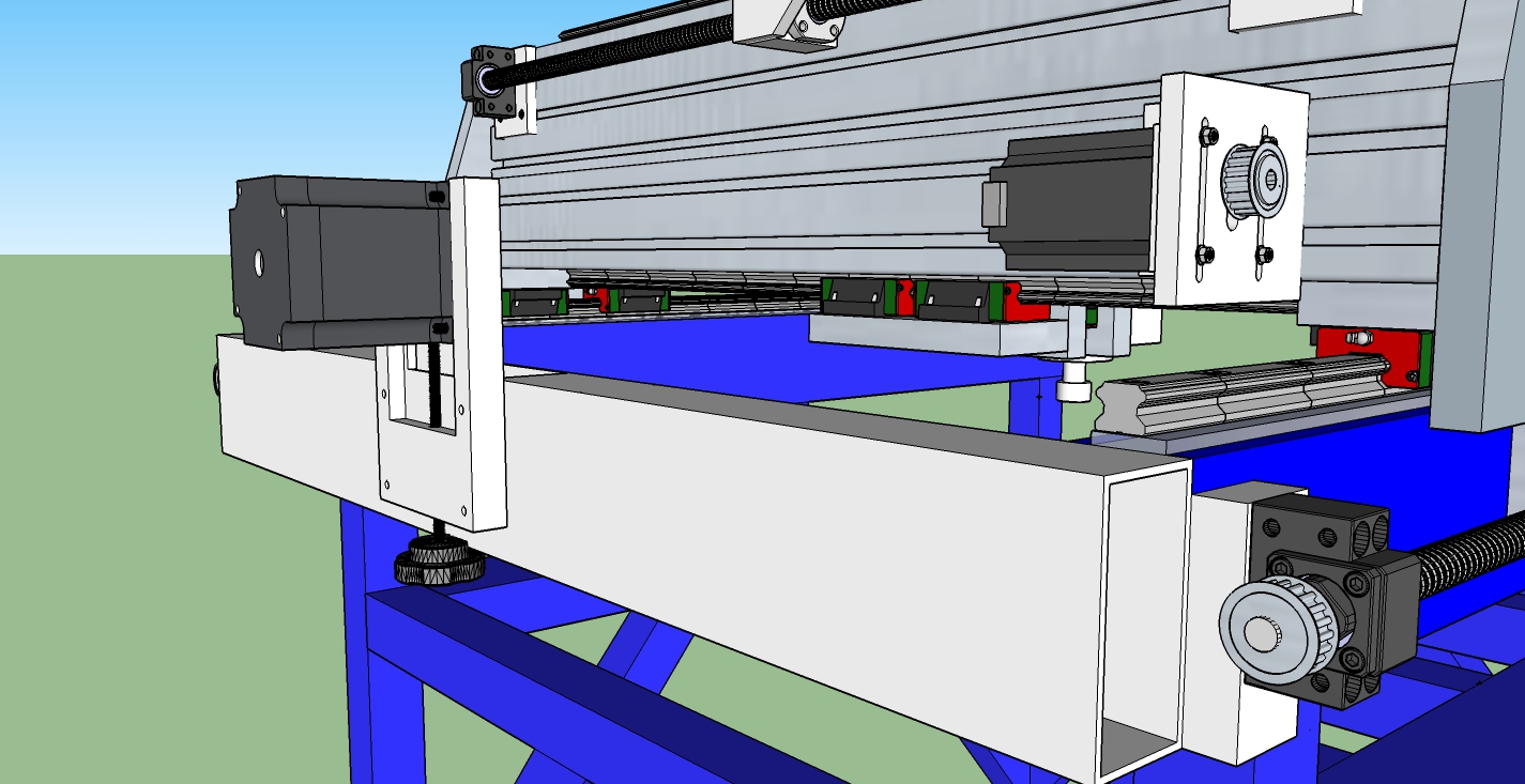 However, I don’t want this function to interfere with the precision of the bed, so I am not too happy with the removable plate. Also, for handling, I find it somewhat impractical to have this opening in the middle of the machine. All that is needed is a jig that will hold the work piece in an accurate and repeatable position. So I was thinking of placing it at the end of the machine, as shown in the model. You simply fasten the work piece with one or two clamps. I may have to extend the cantilevers/ rails to get sufficient overhang for the spindle or alternatively reduce the length of the frame, since this machine is already getting fairly large.