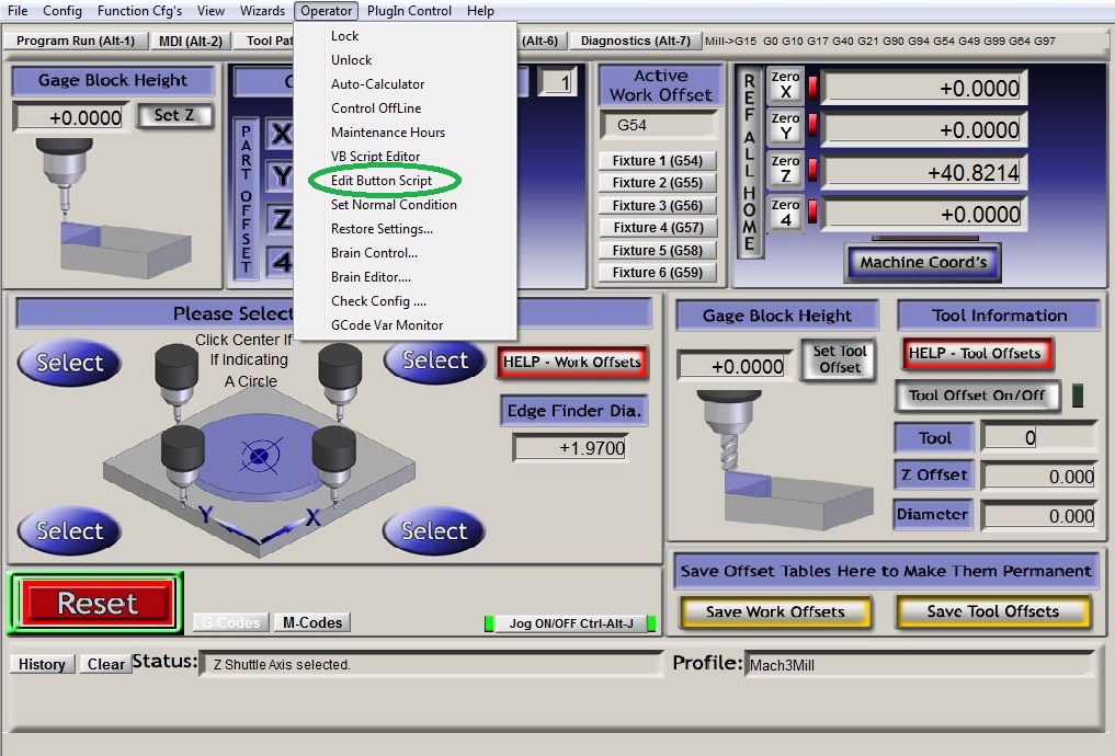 This screen has a number of functions that can be performed using a probe/edge finder this tutorial will be using a touch probe, select the operator button in the file menu bar indicated below.