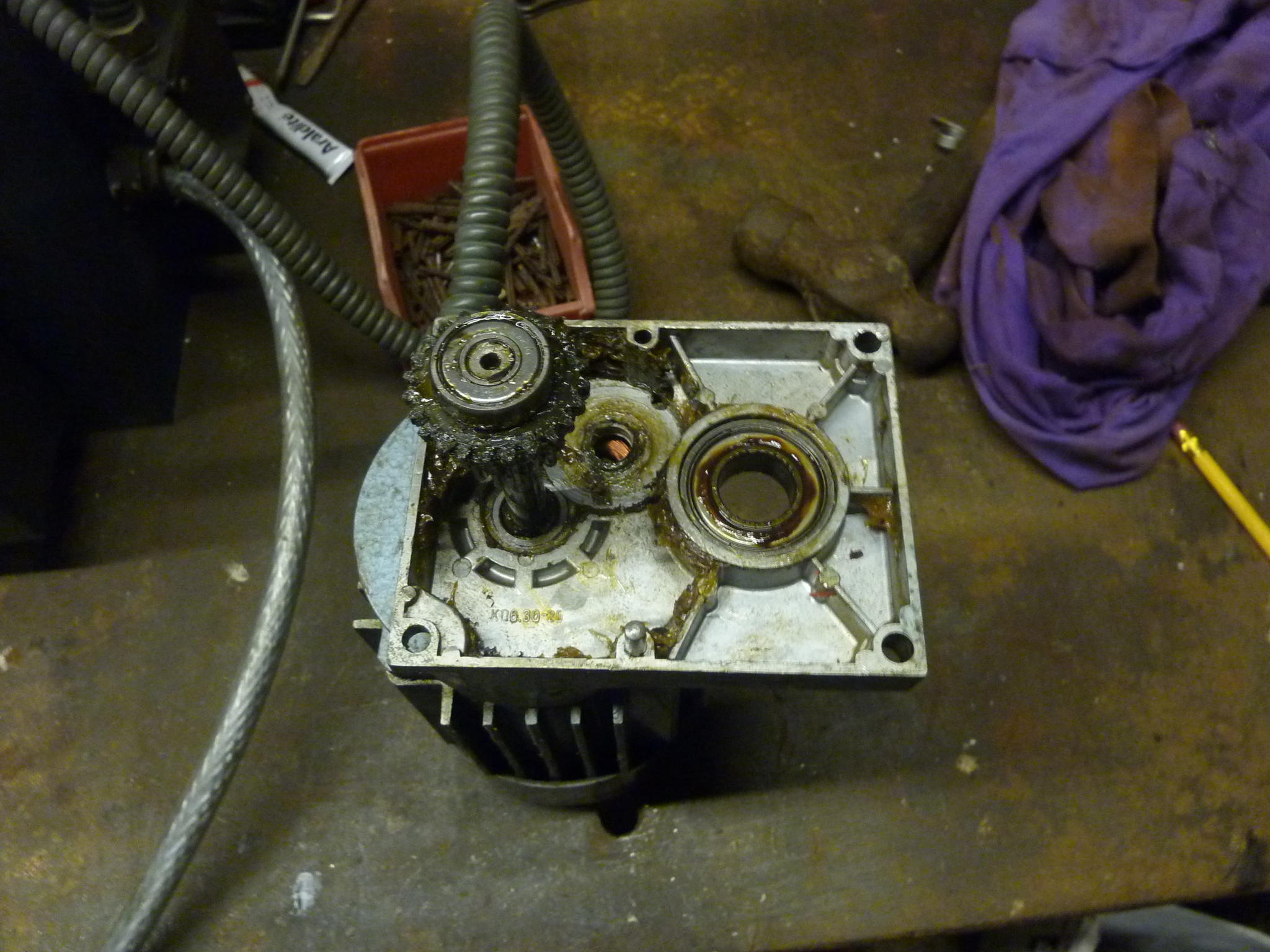 The main problem is that the motor is 415v and the plastic gears in the gearbox are shot. In light of this I think the best option is use a DC motor from a treadmill and convert it to belt drive giving full speed control and 2hp.