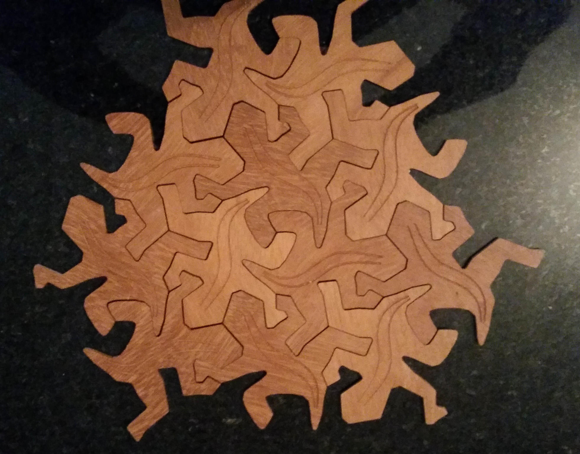 Yes, I found I had to. There are quite a few variations on the same theme, all based on the original "Reptiles" by Escher, but when you look closely none of them quite work (or, at least, none of the designs I found). So I did my own drawing, based around a hexagonal tessellation. But that's probably as much mathematical theory as anyone wants on this forum, so let's just say it took a while to get it right. Then import into Vectric vCarve to do the CAM stuff.