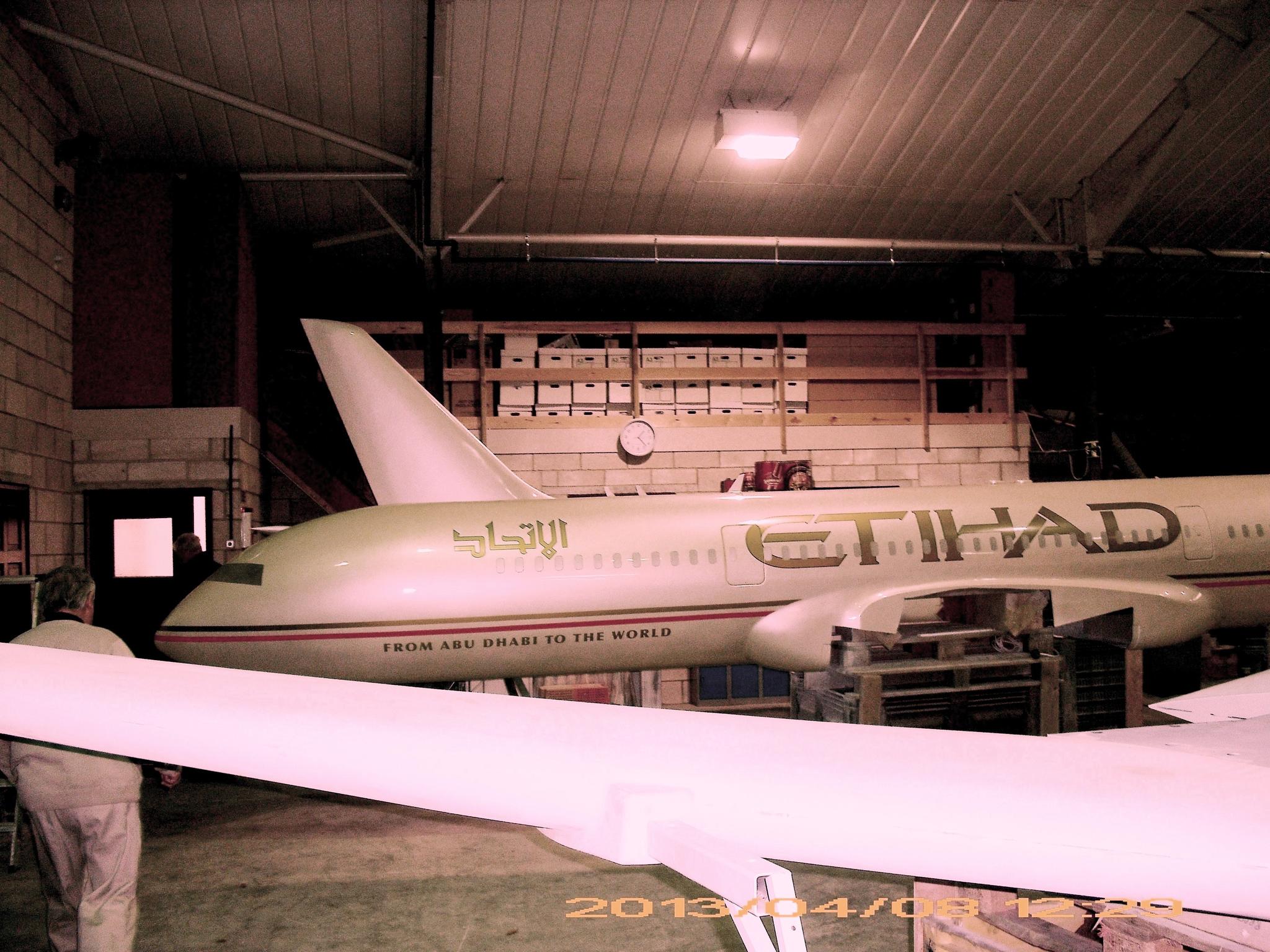 Well its time now to post the remaining pictures of the dreamliner models at Heathrow. After the patterns were finished moulds were taken and mouldings produced, a steel frame (by others) was fabricated and the steelwork was bonded into the fuselage, wings and tailplane. The fuselage and tailplane sections of the model were bonded together, the wings and engines were trial assembled, but removed for transport. I made shadow masks for the cabin window lights to shine through, fixed to internal light boxes containing LED lighting strips. Cockpit, wingtip and tail lights were also fitted. The aircraft were painted in ETIHAD colours and livery vynals were added. I supplied a dxf of the window shadow masks to allow the vynal chaps to supply a mask for the windows prior to painting. As I said earlier,Click image for larger version.