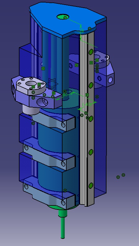 Box-Z design clamping the spindle all round. 15mm 4off profile rails and 8 carriages. Went for the single Z ballscrew in the end as couldn't get a twin ballscrew design to fit and give reasonable travel etc.