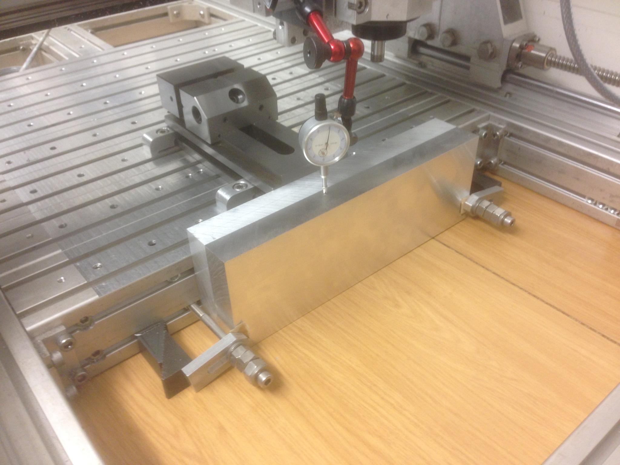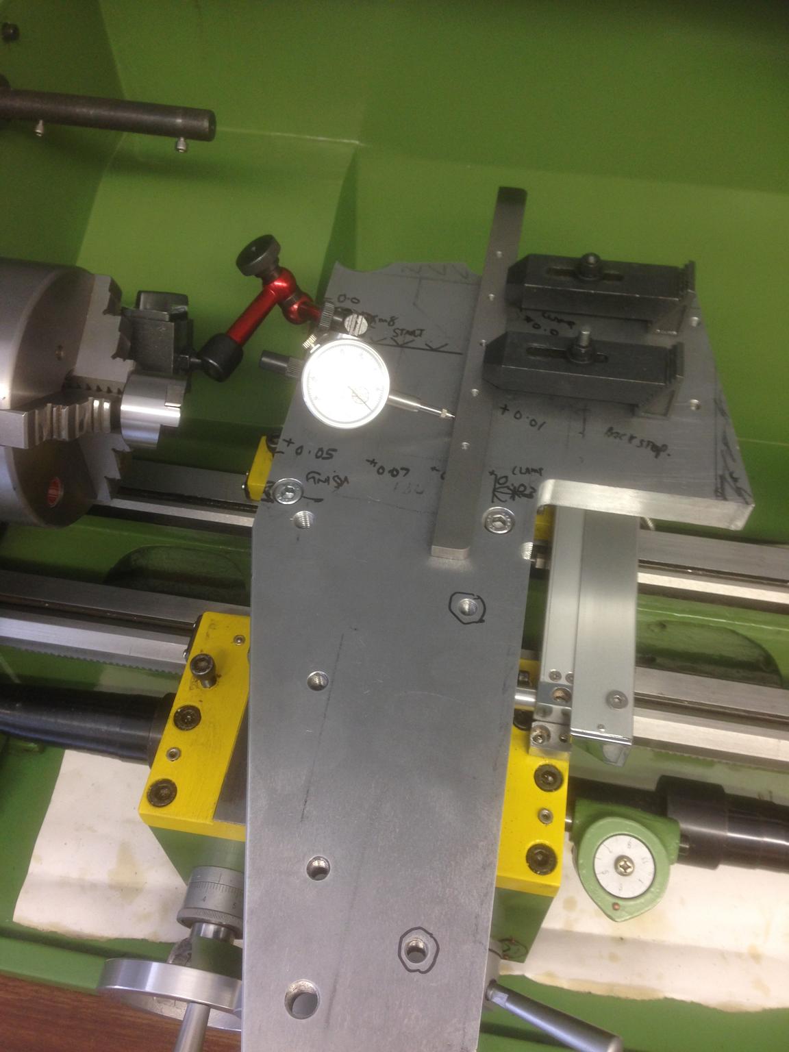 The profile pieces which make up the bed are not accurate enough to be used as a support. The sides are not flat and are not perfectly square to the bed (since that was skimmed by the machine). So I made up a 'tramming' plate: