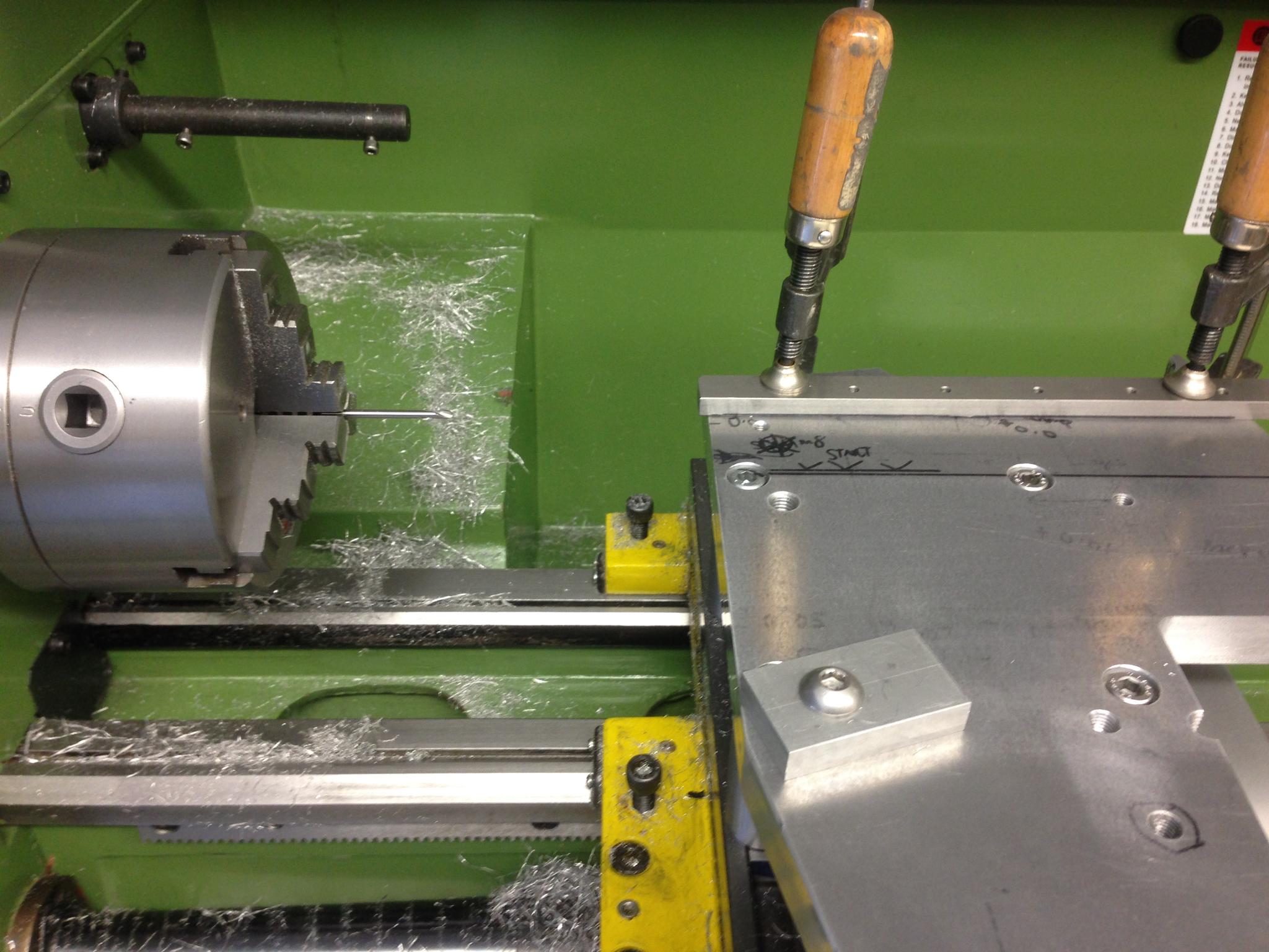 This went OK but I ran out of travel on the carriage so needed to re-position the work closer to the headstock end. By doing this the 2 'tabs' on the end of the work (which were to stop it sliding under the pressure of the drilling) couldn't be used, so I ran without. I noticed after a while that the work had moved on me ! - so, I drilled and tapped some holes and mounted it directly to the plate, using the strap clamp I'd made earlier. This was much better. You'd think I'd have learnt by now that clamps can't hold work pieces and stop them sliding if the tool pressure is high.