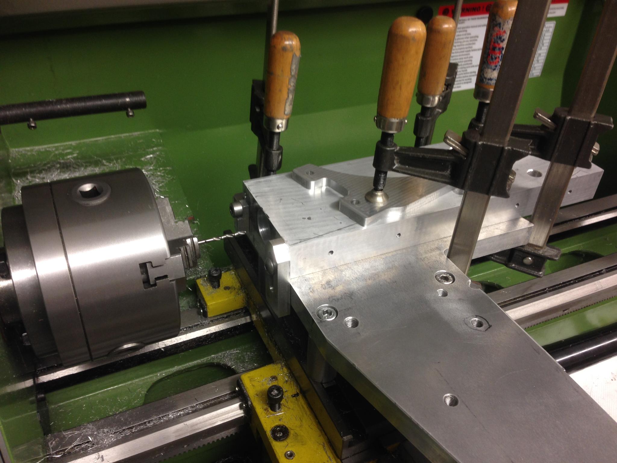 There are a few jobs to do on the main spindle housing. Boring pilot holes on both sides of the block: