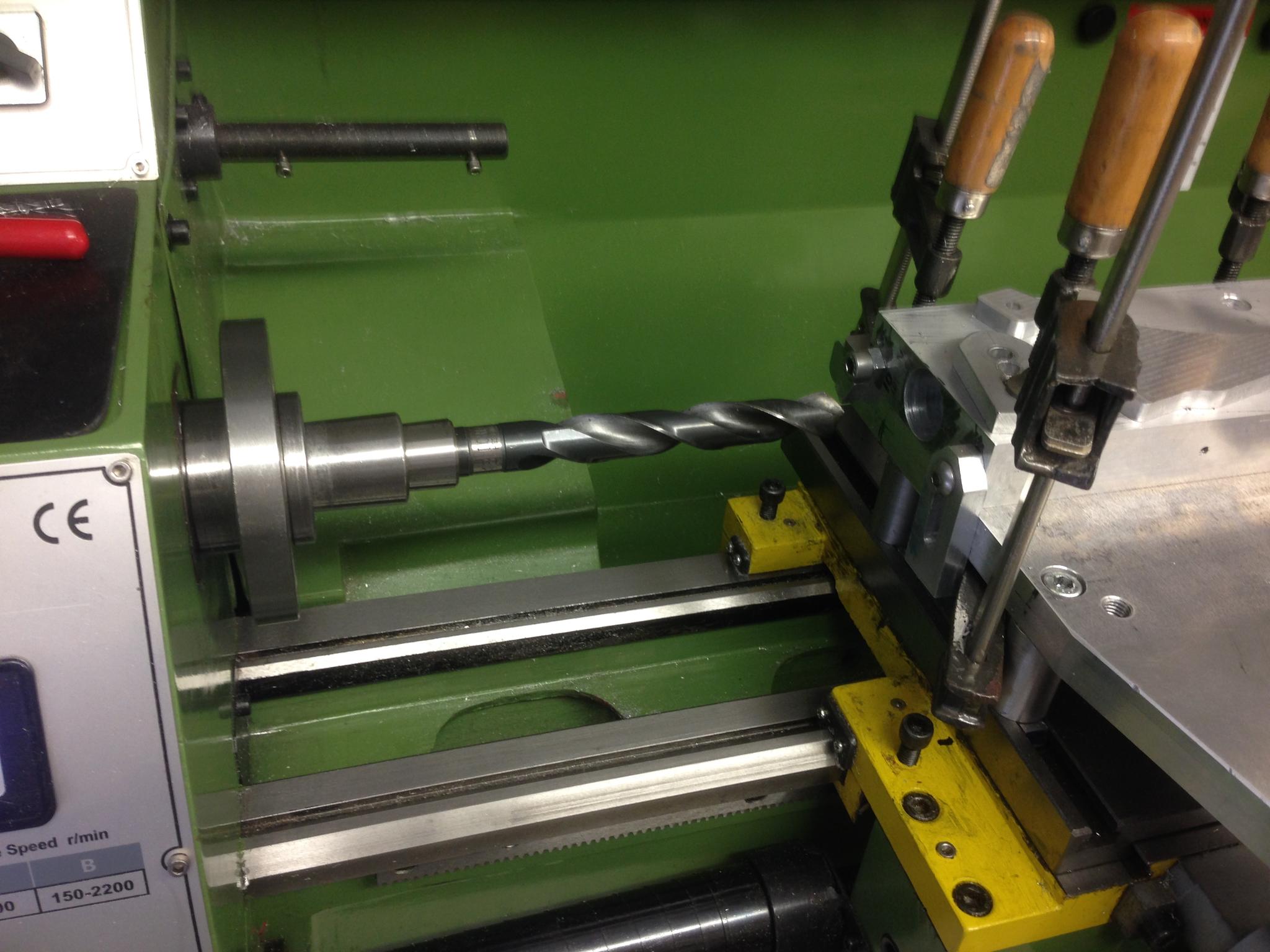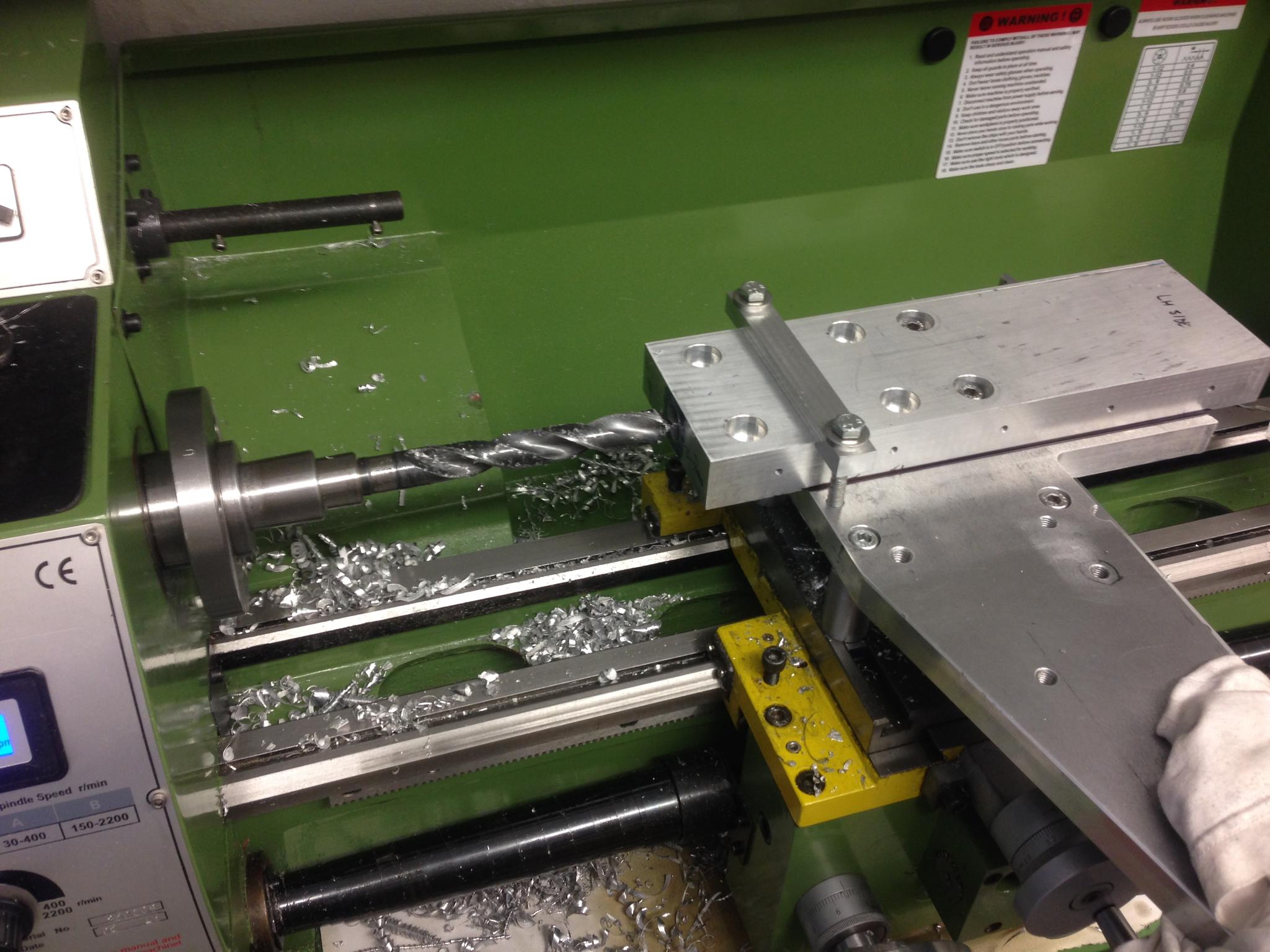 Basically this meant I had got the lathe platform at exactly the right height, with the centre of the chuck in line with the centre of the part. The next op on the lathe is to drill an 18 mm clearance hole (for the ballscrew) about 190 mm deep into the part.